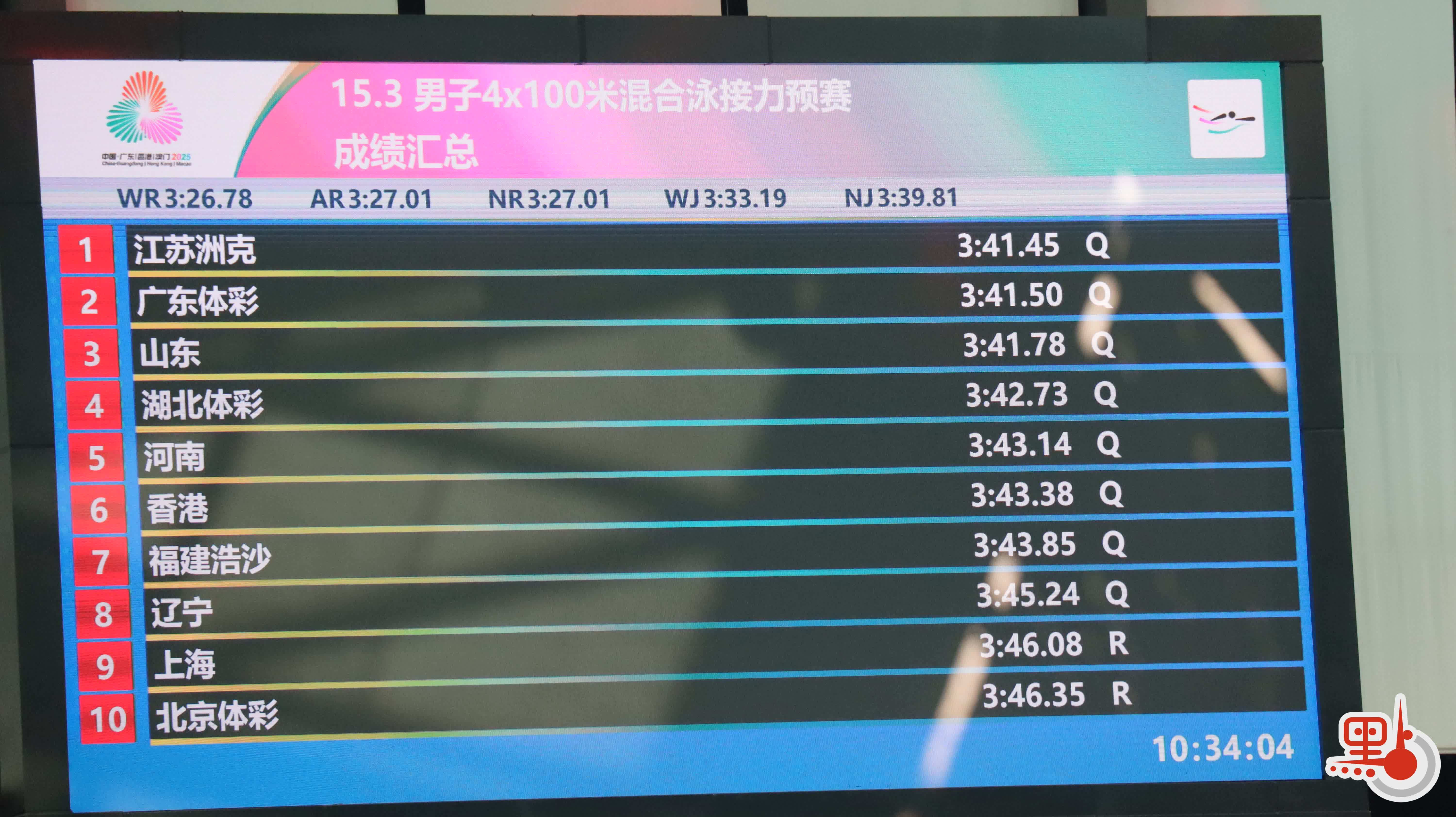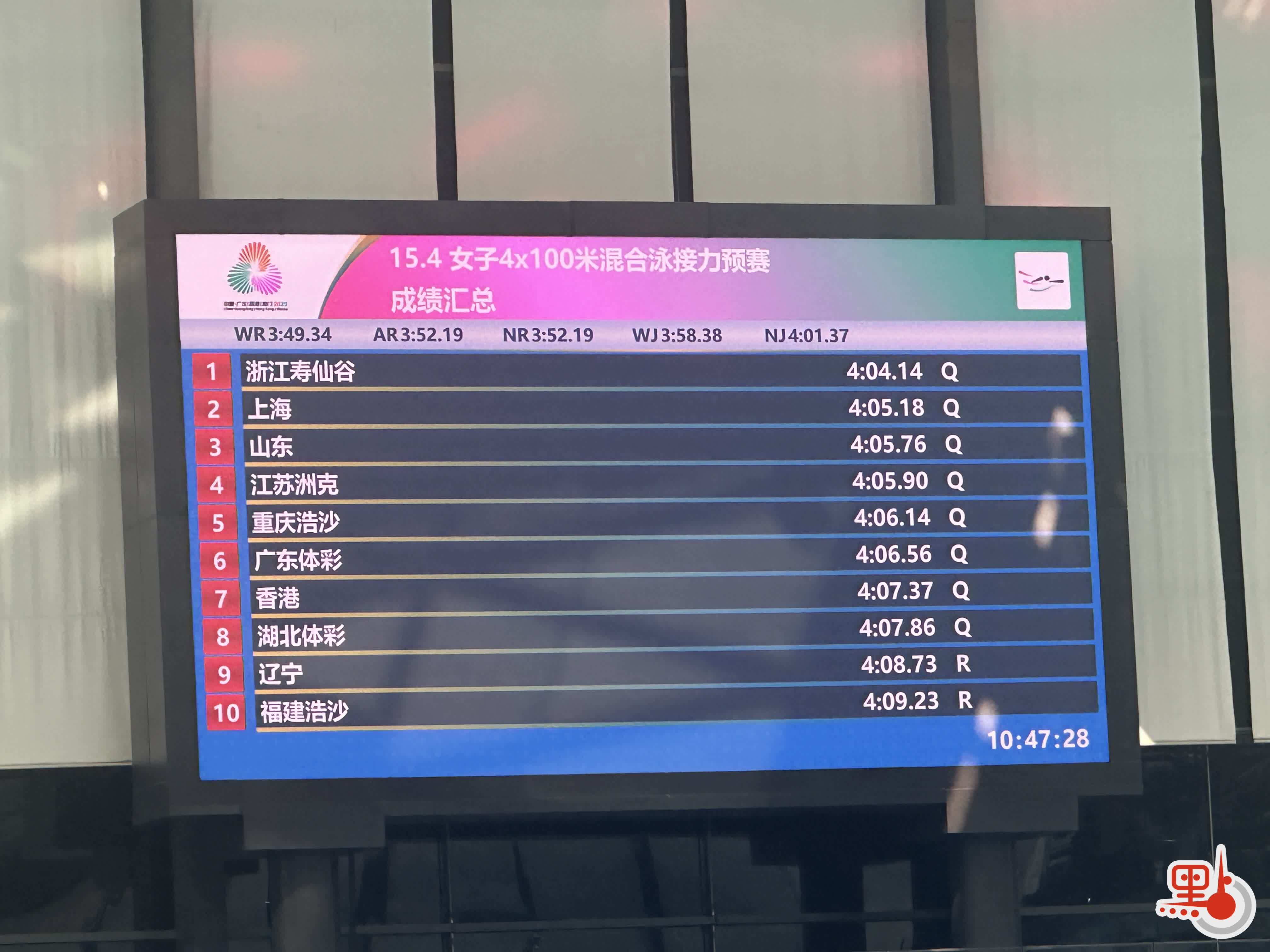 而在女子4×100米混合泳接力預賽中,由張心悅、文薈喬、楊凱晴和李芯瑤組成的香港隊游出4分07秒37的成績,位列總排名第七,同樣拿到決賽入場券。