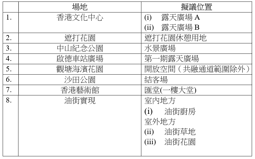 根據康文署網站附錄,8個開放場地分別為香港文化中心、遮打花園、中山紀念公園、啟德車站廣場、觀塘海濱花園、沙田公園、香港藝術館及油街實現,視乎場地最多可供租用的日數介乎10天至351天,可舉辦的活動包括商業推廣活動、粉絲見面會或簽名會、生日派對等。至於其他康文署場地,可根據所委聘營辦商的意見或專業知識按個別情況予以考慮。