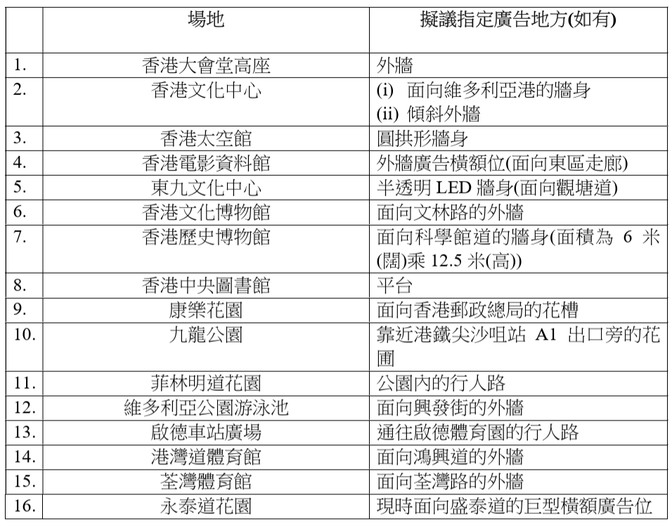 開放刊登商業廣告的16個地點,包括香港大會堂高座外牆、太空館圓拱形牆身等。康文署計劃委聘專業營辦商,向他們批出活動策劃和廣告服務經營權,為期兩年或三年,每月須向政府繳付經營權月費。所有活動及廣告事先須經過康文署審批,如果服務良好,經營權可獲延長最多兩年。