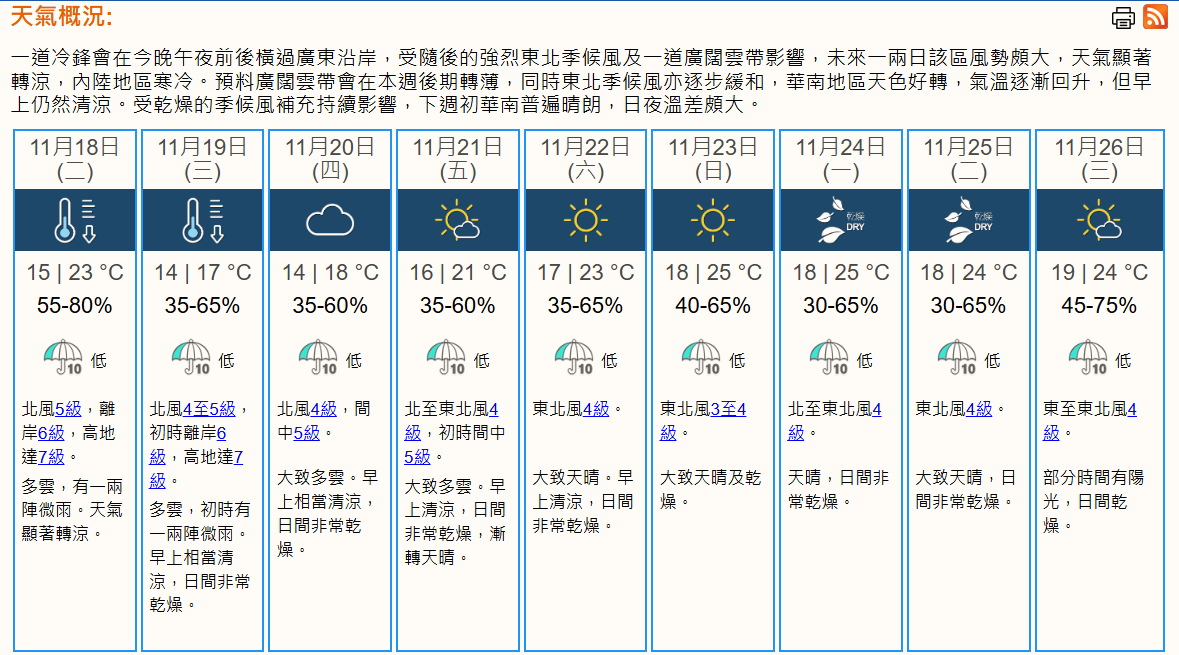天文台署理助理台長謝淑媚在記者會上表示,一道冷鋒正向南移動,預料會在今晚午夜前後橫過廣東沿岸。受隨後的強烈東北季候風影響,本港未來一兩日風勢頗大,天氣顯著轉涼。同時,受一道廣闊雲帶影響,預料本港多雲及有一兩陣微雨。星期三及星期四市區最低氣溫在14度左右,新界部分地區寒冷。由於風勢頗大,風寒效應會較為明顯。預料本周後期早上仍然清涼。市民尤其是長者、慢性病患者或有戶外活動計劃的朋友,應留意天氣變化,準備適當保暖措施。