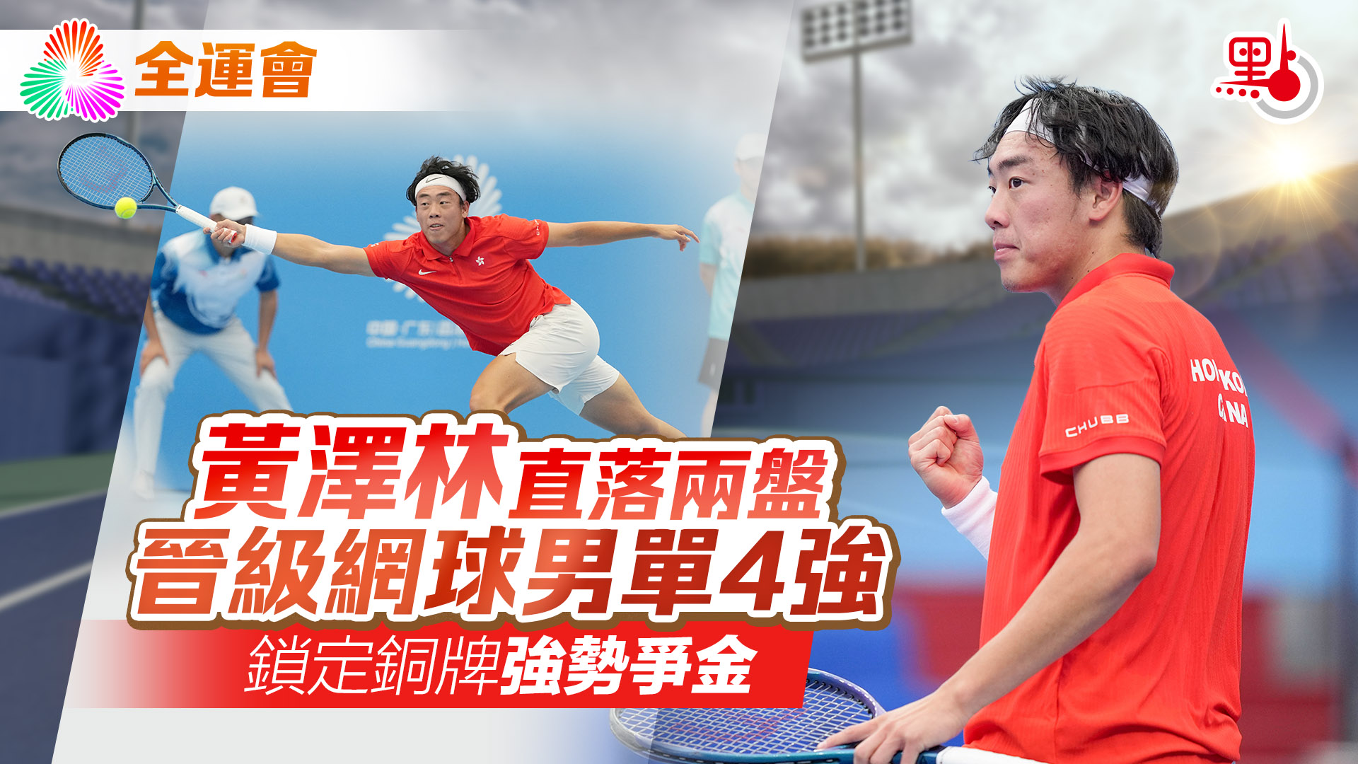 【點新聞報道】今日(18日)進行的全運會網球男單8強賽事中,港隊黃澤林直落兩盤擊敗對手崔杰,順利晉級四強,穩奪一面銅牌。