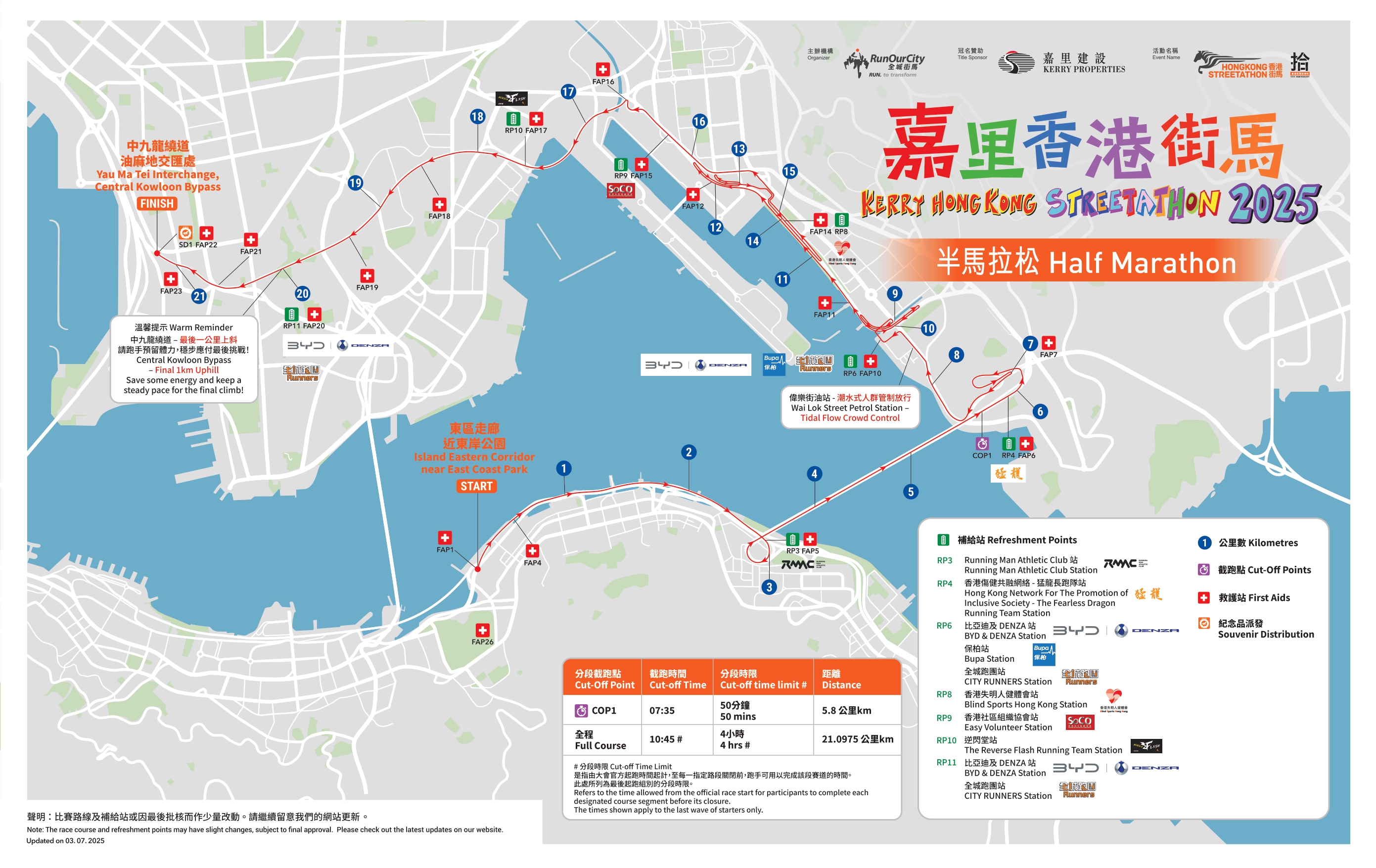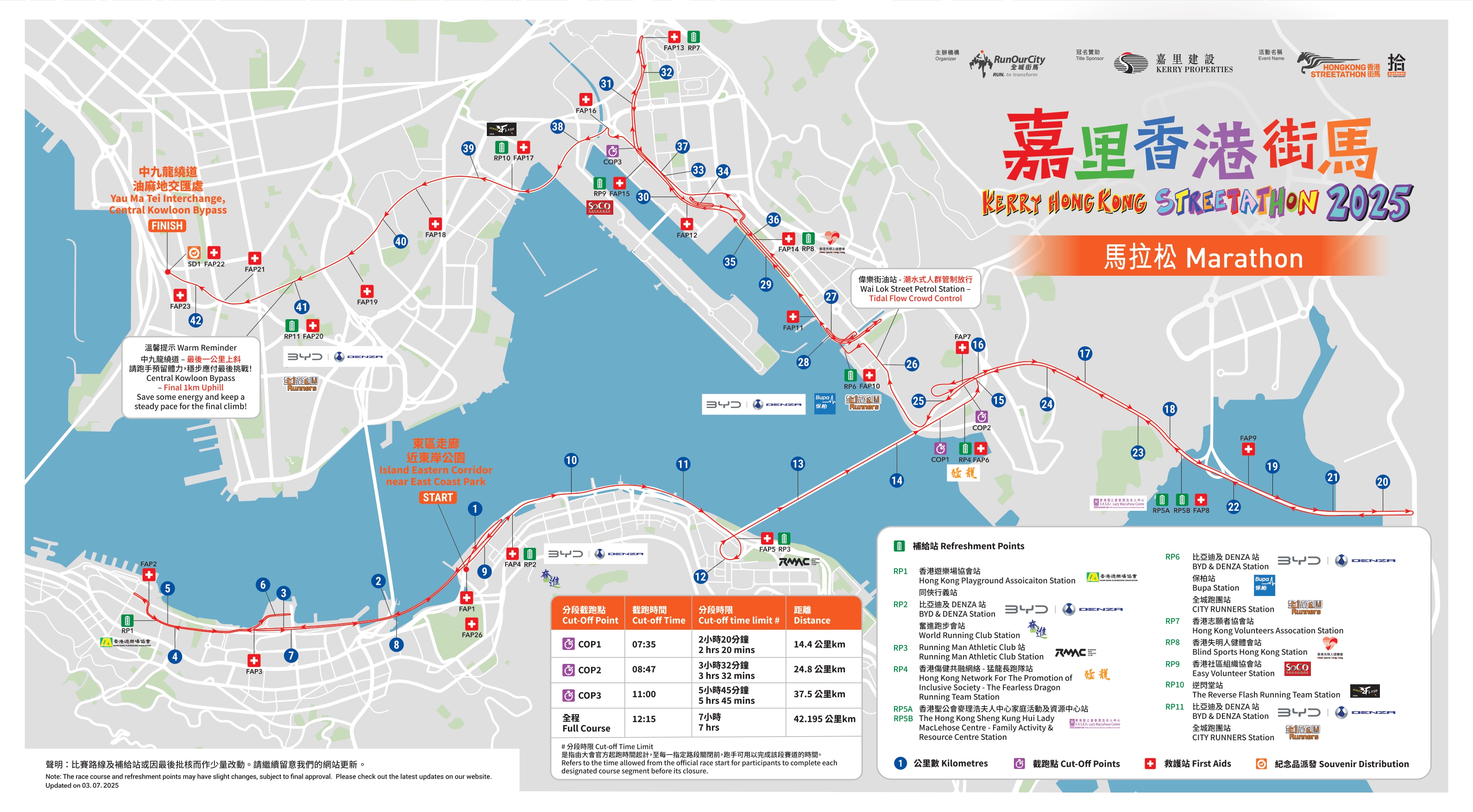 因應賽事安排及進度,比賽沿途路段將會在當日凌晨一時起分階段實施臨時封路安排,直至約下午一時道路重開為止。駕駛人士請留意現場交通標誌,並考慮使用替代路線前往目的地。