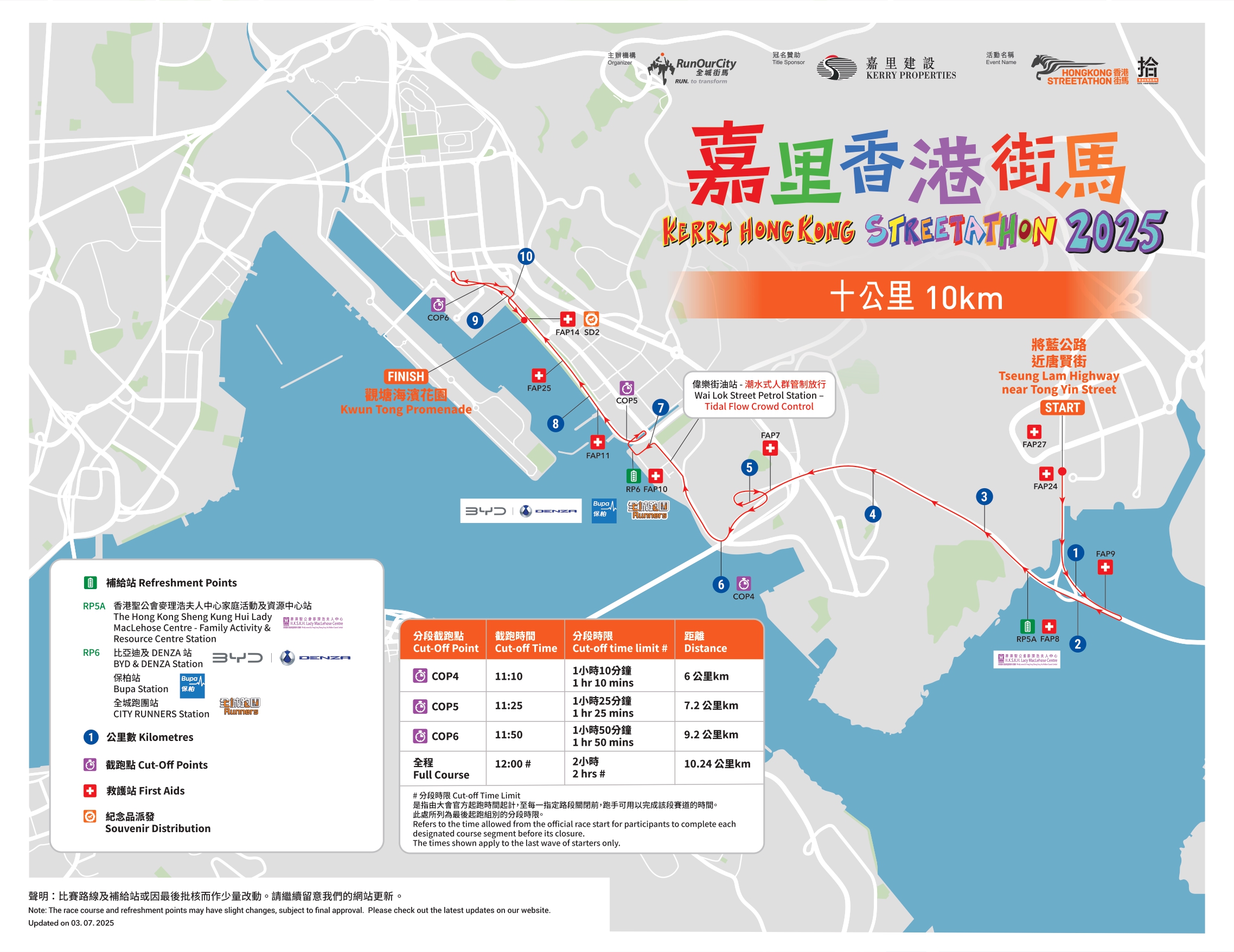 十公里比賽則以將藍公路近唐賢街為起點,經將藍公路、茶果嶺道、觀塘繞道及海濱道,前往觀塘海濱花園的終點。