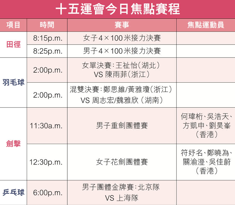 第十五屆全國運動會20日進入競賽單元尾聲,除女子水球外,其他尚在進行的賽事都將收官,共決出35枚金牌。男乒團體決賽,馬龍、王楚欽領銜的北京隊對陣樊振東、許昕率領的上海隊;羽毛球混雙奧運冠軍「雅思組合」要衝擊全運首冠。