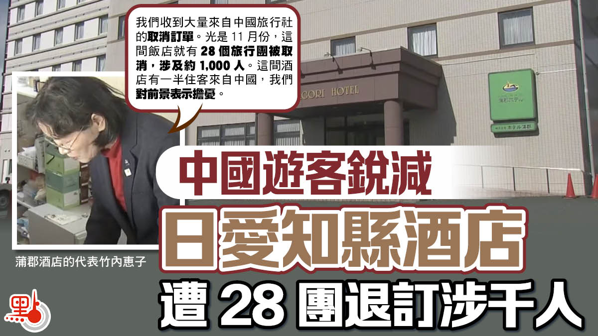 來自蒲郡酒店的代表竹内恵子向日本中部CBC電視台表示:「我們收到大量來自中國旅行社的取消訂單。目前,今年剩餘的中國旅行團都已取消預訂。」