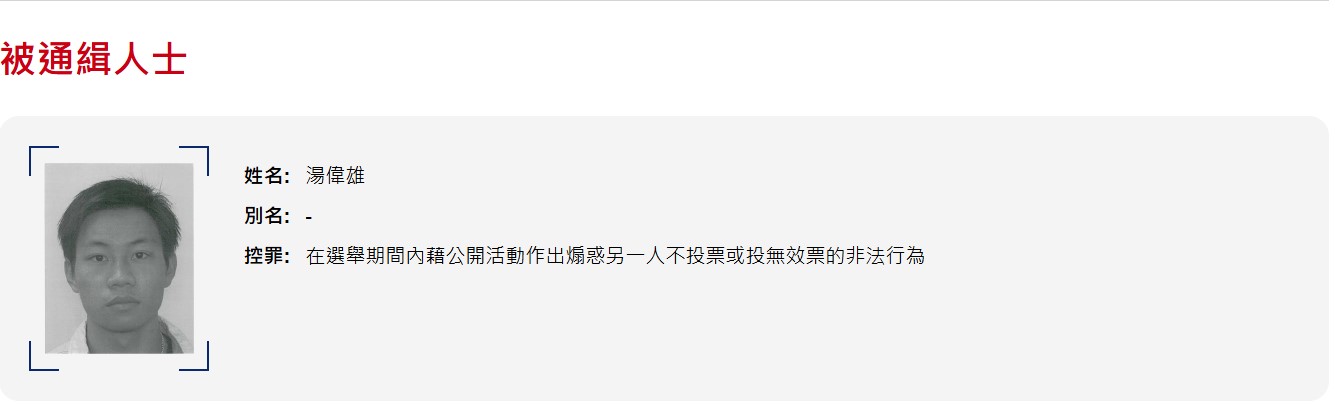 另外,廉署今早獲裁判官簽發手令,通緝已離港的姜嘉偉及湯偉雄。姜嘉偉,34歲;及湯偉雄,44歲,各面對兩項控罪,即在選舉期間內藉公開活動作出煽惑另一人不投票的非法行為,違反《選舉條例》第27A(1)(a)條。控罪指二人涉嫌在2025年立法會選舉的選舉期間,各自在其社交媒體專頁,展示煽惑他人在該選舉中不投票的帖文。