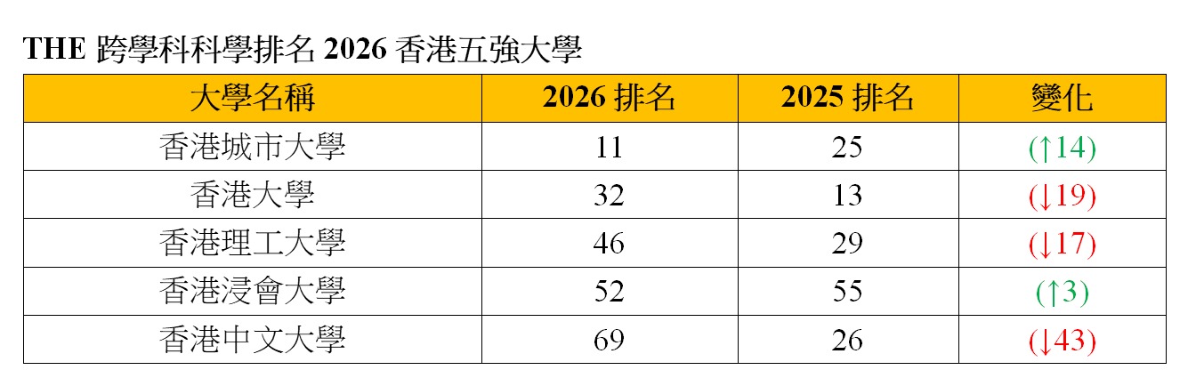 【點新聞報道】跨學科領域融合對未來世界科研與教育愈趨重要,泰晤士高等教育(THE)與施密特科學研究員項目今日(20日)公布「跨學科科學排名2026」,香港高等教育表現優秀,共有5所大學獲得前70名成績,平均分數為各地區中最佳。其中香港城市大學躍升14位至第11名,為全港榜首,創下歷史佳績。該校並於「投入」指標獲排全球第一,確立其積極投放資源及撥款支持跨學科科研項目的努力。