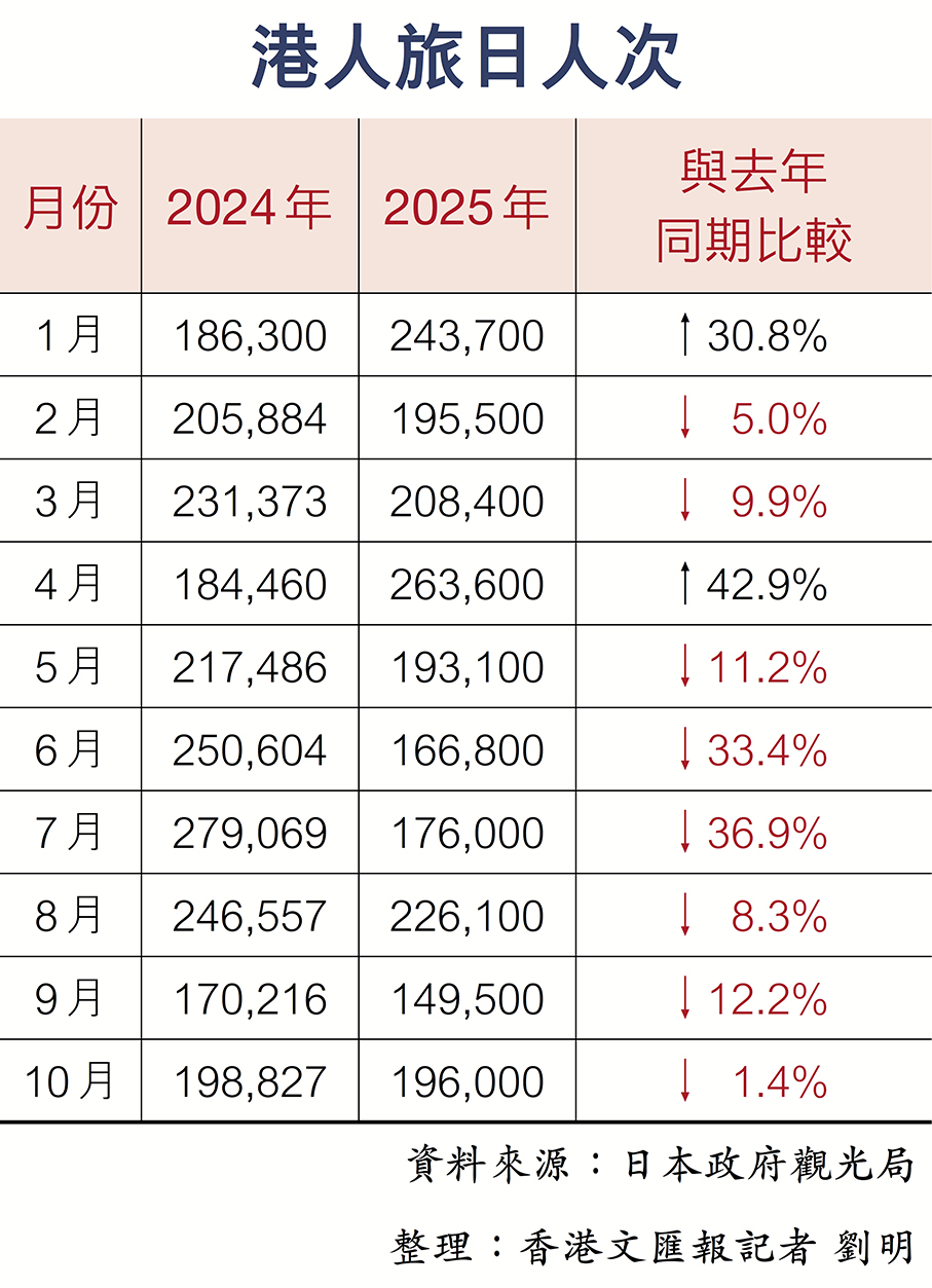 日本今年屢有負面消息,影響港人到當地旅遊意慾,繼大地震傳聞後,7月起相繼有中國公民在日本遇襲,本月初又發生棕熊襲擊路人事件,加上高市早苗的涉台錯誤言論,令港人反感及對赴日旅行卻步。翻查日本政府觀光局的數據,香港巿民到訪日本人數,由今年5月起便持續呈現跌幅,如今年7月暑假開始的旅遊旺季,赴日港人不足18萬人次,較去年7月的近28萬人勁跌近三成七。