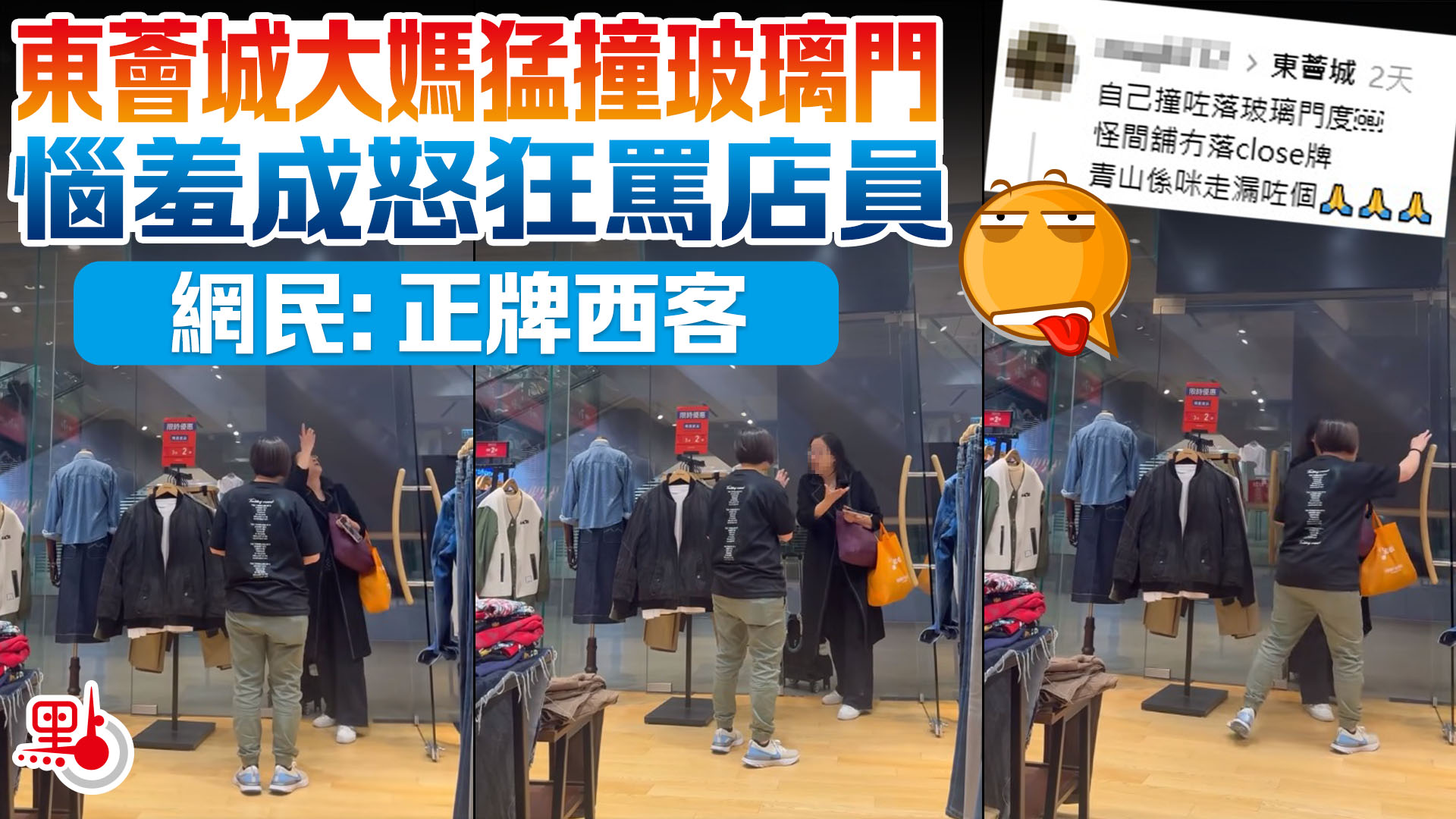 有網民在社交平台threads發布一段影片,寫道:「自己撞咗落玻璃門度,怪間舖冇落close牌,青山係咪走漏咗個」。從影片可見,事發於東涌東薈城某間時裝店門外,當時店舖已關門。惟一位身穿黑色上衣、手拎購物袋的大媽,沒有察覺店舖已關門,結果迎頭撞上玻璃門。