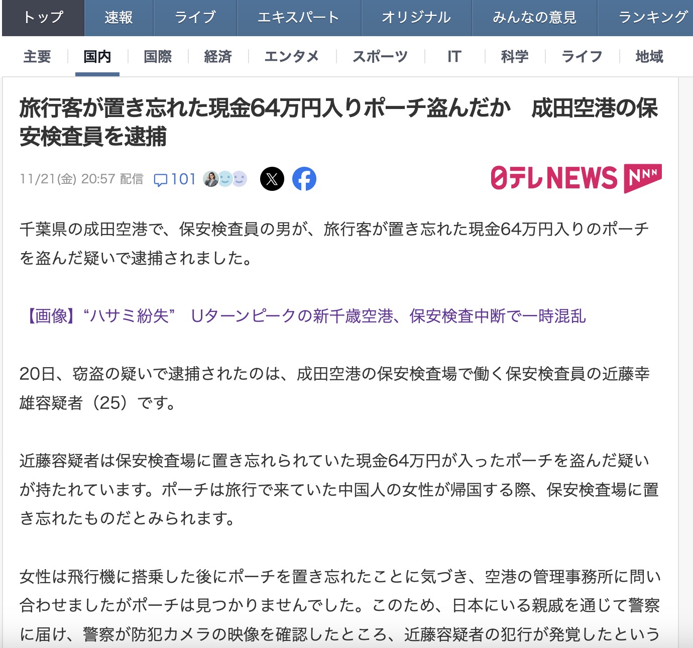 【點新聞報道】據環球時報援引日本《每日新聞》網站21日報道,成田機場一名安檢員因盜竊一名中國遊客行李中的現金,於日前被日本警方逮捕。