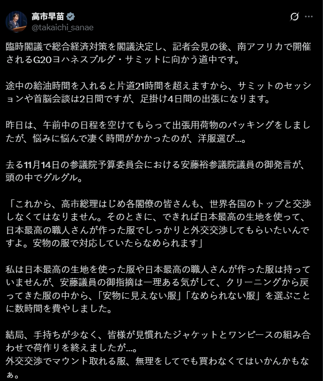 高市早苗此前發文糾結要穿什麼衣服。「昨天休息一天收拾行李準備出差,但卻為穿什麼衣服而糾結了很久。」表示花了幾個小時挑選衣服,並稱,如果穿着廉價的衣服,擔心會受到輕視。