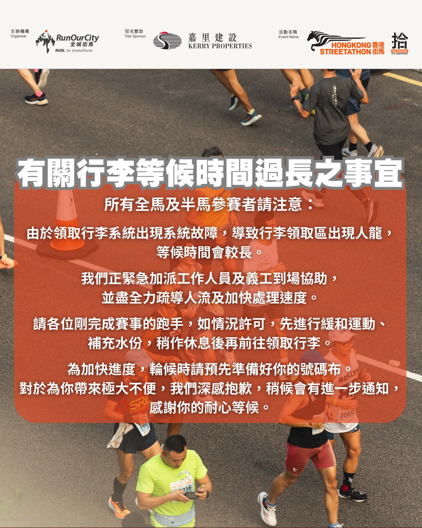 全城街馬聯合創辦人及行政總裁梁百行表示,行李領取系統出現問題,難以估計受影響人數,但推算上午9時至11時衝線後領取行李的跑手最受影響。據他了解,有跑手等候了一至兩小時,對此致歉,形容是意料之外,會積極檢討,在抽調及加派人手和警方協助下,全馬和半馬跑手中午約12時45分已全部完成領取行李。