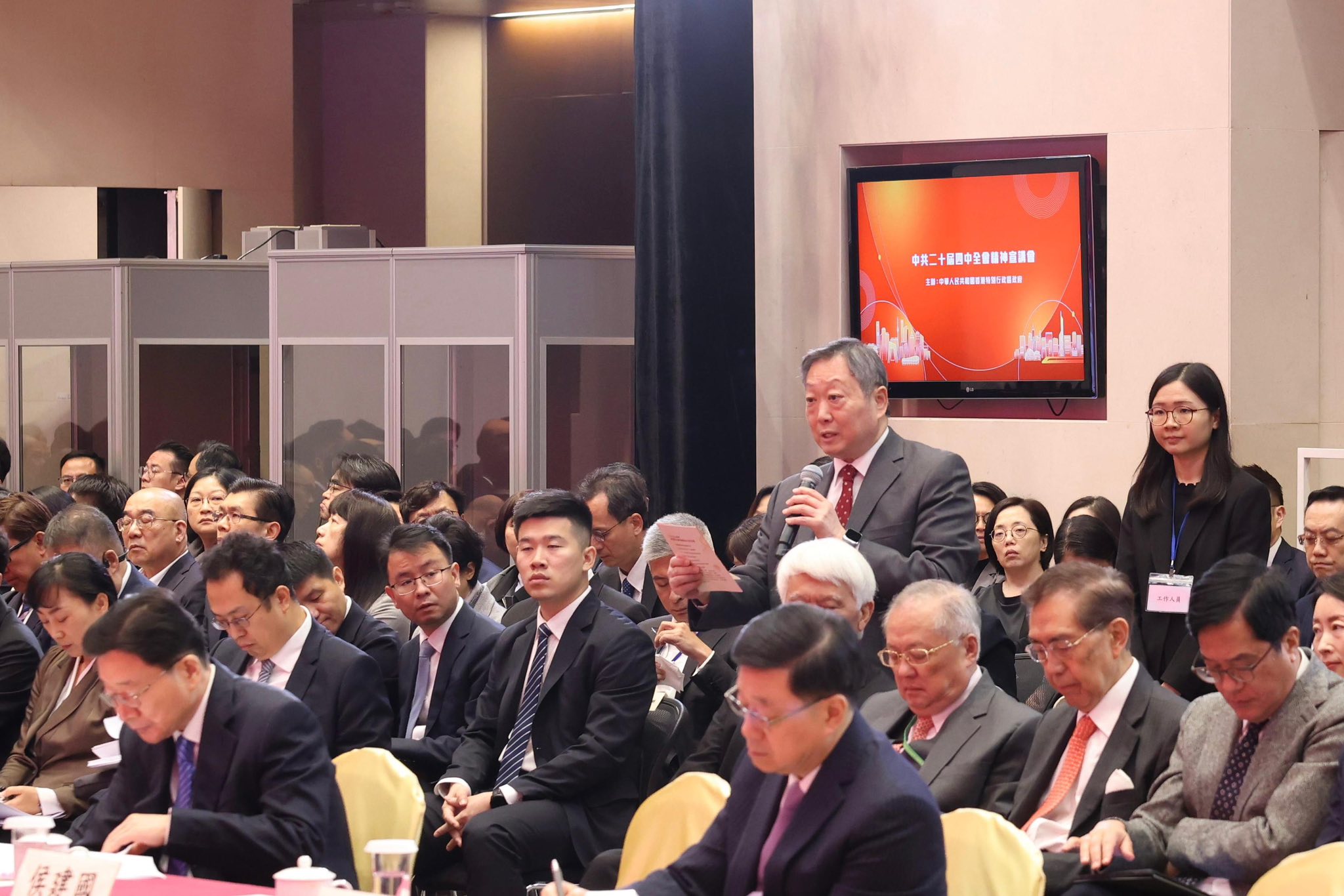李家超指出,出席今天首場宣講會的包括特區政府官員、行政會議成員、立法會議員、司法界代表,以及重要法定機構負責人共約500人。另外,獲邀出席明天次場宣講會的社會各界代表,包括港區全國人大代表、港區全國政協委員、主要政團社團代表,以及工商界、專業界、教育界、傳媒界及青年代表等。