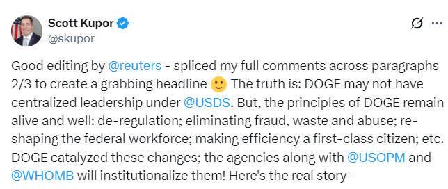 隨後,庫珀本人在社交媒體上發文,對路透社的報道進行了反駁。他表示,「政府效率部」或許不再會有「集中化的領導」,但其工作準則將繼續保留:減少章程架構;減少欺詐、浪費和濫用;重塑聯邦人力結構;將效率放在首位等等。「政府效率部」催動了相關變革,美國人事管理局、白宮管理和預算辦公室一起將其制度化,「這才是真相」。