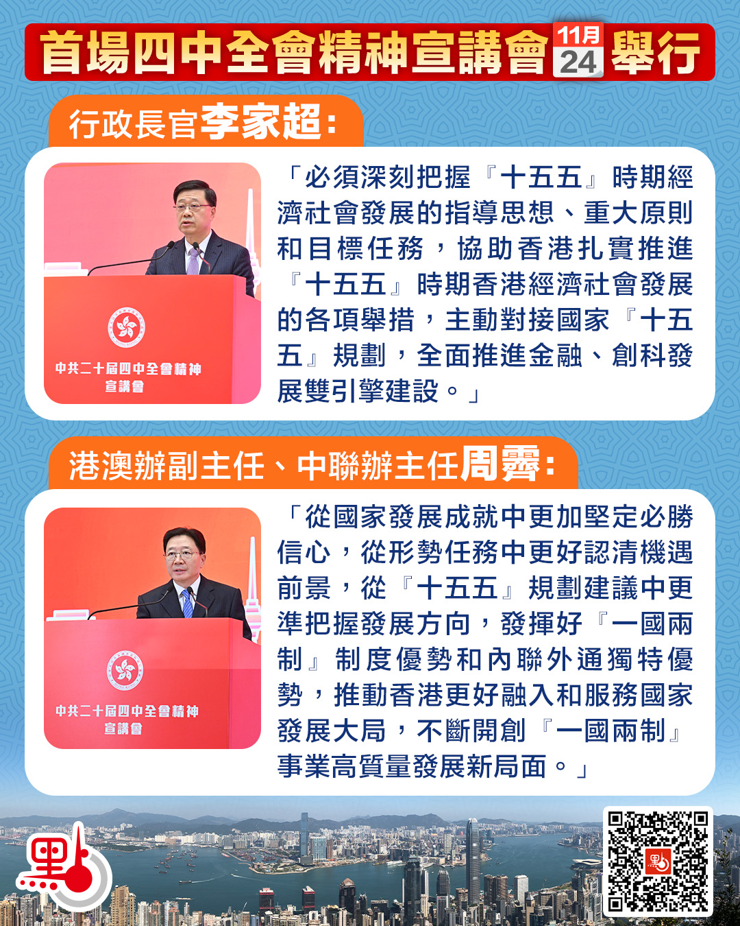 李家超表示,中共二十屆四中全會意義重大,是在國家「十四五」規劃圓滿收官、「十五五」規劃謀篇布局的關鍵節點召開的一次重要會議。學習貫徹好二十屆四中全會精神是重大任務,「十五五」規劃建議聚焦高質量發展,透過培育「新質生產力」實現科技自立自強,以及擴大高水平對外開放,為香港帶來歷史性的契機。他強調,必須深刻把握「十五五」時期經濟社會發展的指導思想、重大原則和目標任務,協助香港扎實推進「十五五」時期香港經濟社會發展的各項舉措,主動對接國家「十五五」規劃,全面推進金融、創科發展雙引擎建設,與世界各地展開更廣泛、更緊密的交流合作,積極融入和服務國家發展大局戰略。