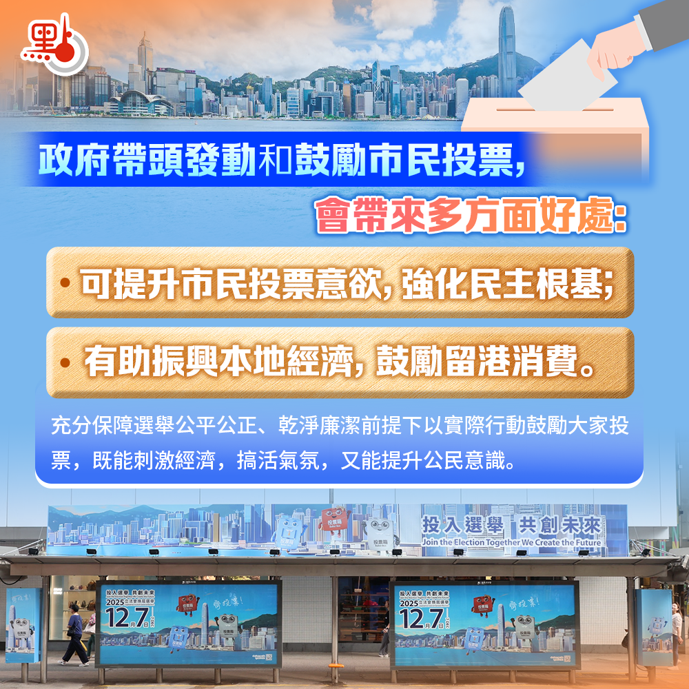民主並不是不食人間煙火,而是與民生密切相關。選出歷史上最有水平的一屆立法會,推動行政立法良性互動,目的就是進一步推動良政善治,滿足市民不斷增長的對美好生活的期盼,提升市民的獲得感和幸福感。對特區政府來說,在充分保障選舉公平公正、乾淨廉潔的前提下以實際行動鼓勵大家投票,既能刺激經濟,搞活氣氛,又能提升公民意識,何樂而不為!