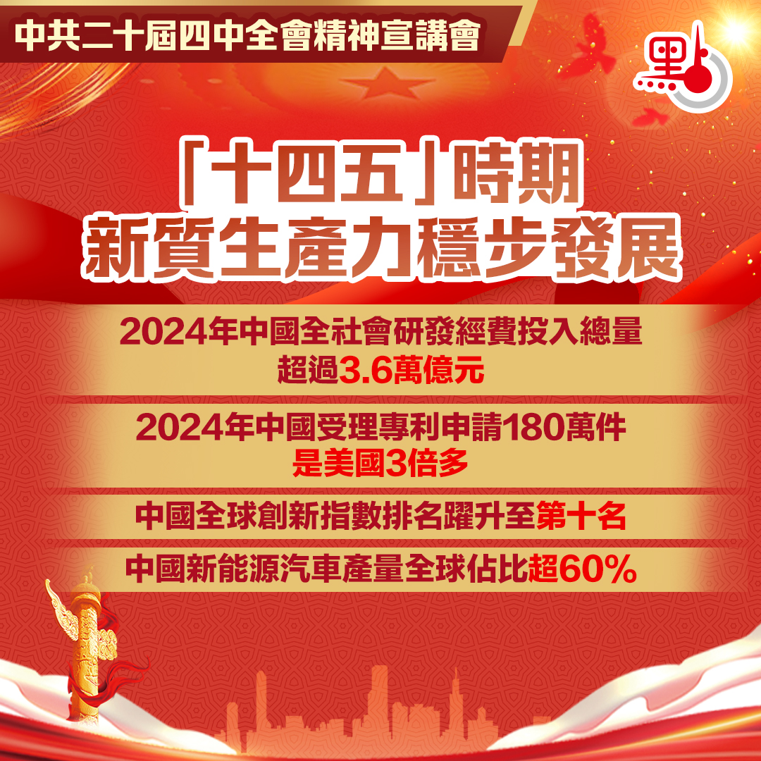 【點新聞報道】應香港特別行政區政府請求,經中央批准,中央港澳工作辦公室、國務院港澳事務辦公室邀請中央宣講團成員,中國科學院院長、黨組書記侯建國和中央宣講團成員,中央財經委員會辦公室副主任、中央農村工作領導小組辦公室副主任祝衛東來港宣講中共二十屆四中全會精神。特區政府今日(25日)上午在政府總部舉行宣講會,向社會各界人士宣講中共二十屆四中全會精神。祝衛東宣講時表示,中國新質生產力穩步發展,2024年中國全社會研發經費投入總量超過3.6萬億元,僅次於美國。