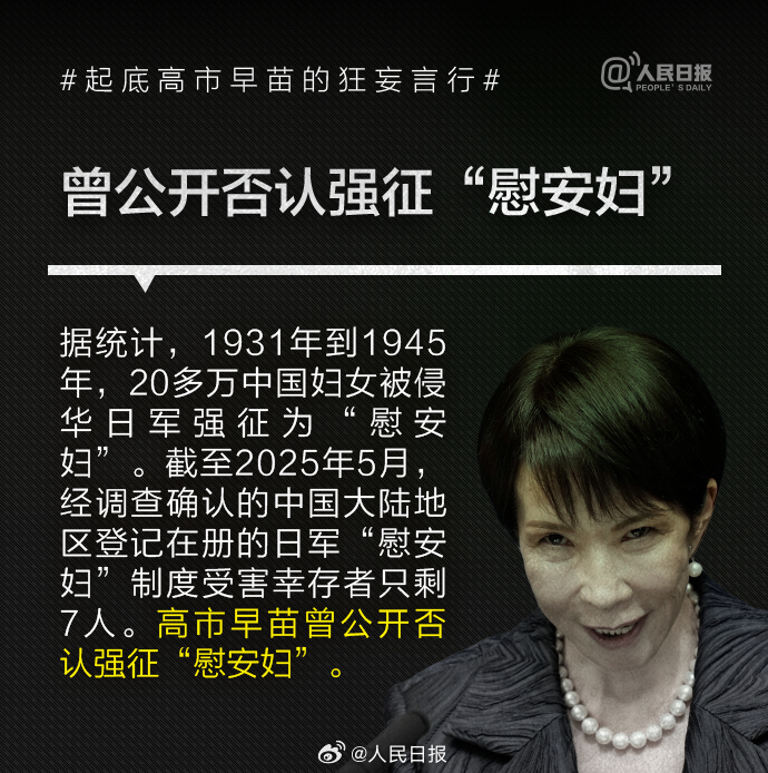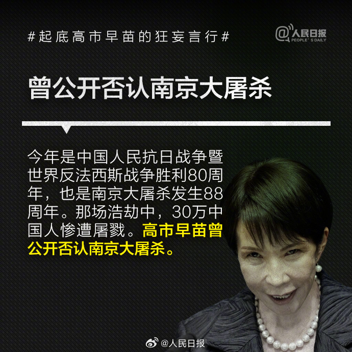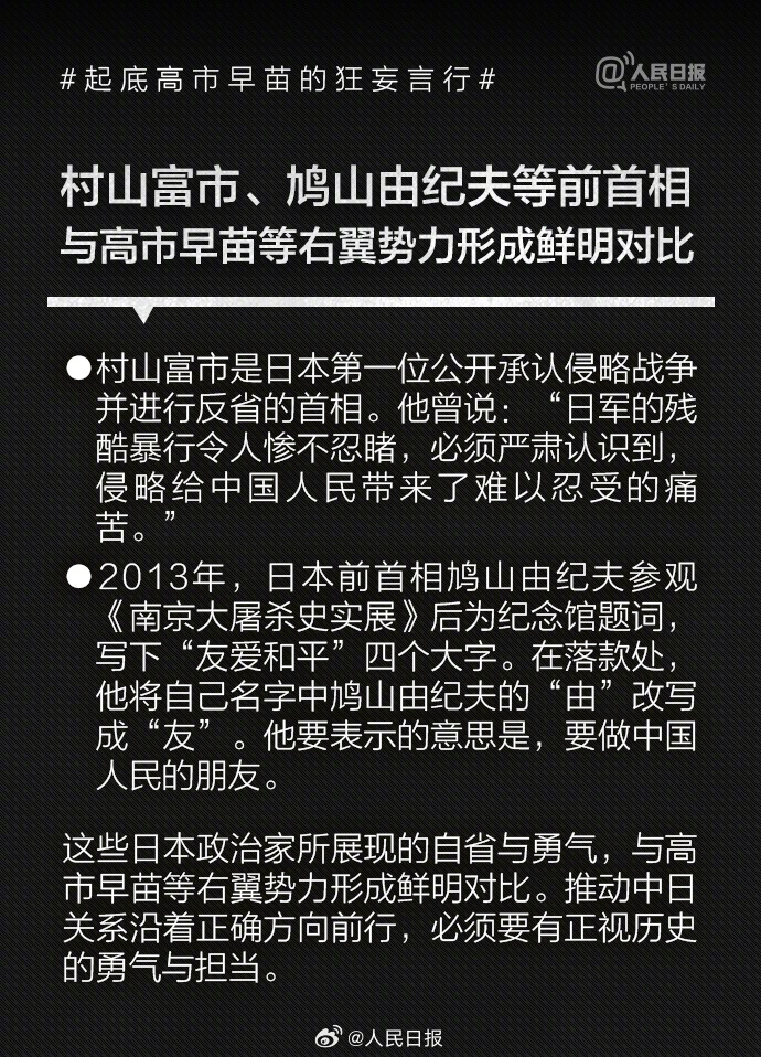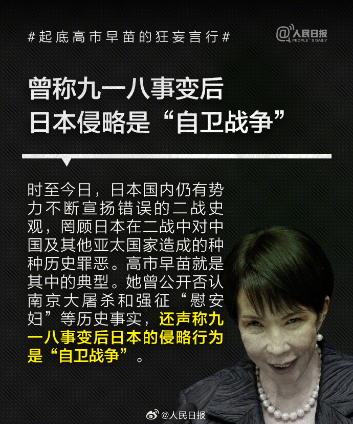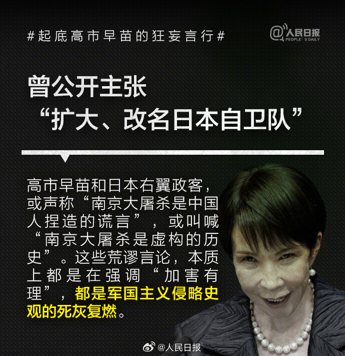 1993年高市早苗當選日本國會議員後,公開主張修改日本和平憲法、擴大和改名日本自衛隊、參拜靖國神社,其言行與許多臭名昭著的日本右翼政客如出一轍。高市2014年來參拜靖國神社超10次。高市早苗曾公開否認南京大屠殺和強徵「慰安婦」等歷史事實,還公然聲稱九一八事變後日本的侵略行為是「自衛戰爭」。歷史的教訓豈敢忘卻!絕不允許日本軍國主義復活,破壞世界和平穩定。