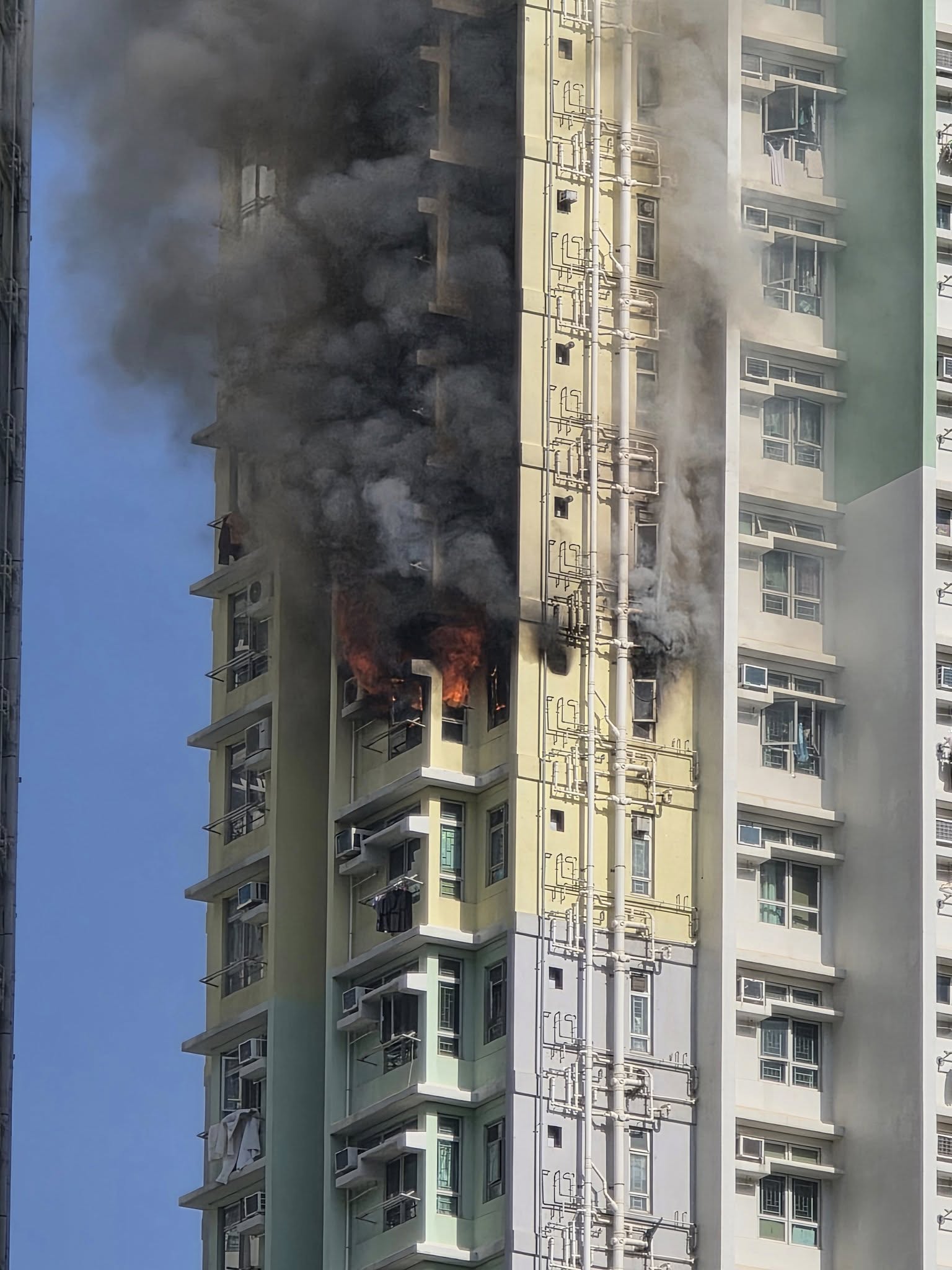 【點新聞報道】九龍灣啟晴邨發生火警。今日(25日)下午2時許,位於九龍灣啟晴邨樂晴樓一個單位冒出濃煙起火,其間傳出爆炸聲。現場畫面可見,涉事單位火勢兇猛,滾滾濃煙一度飄至上空,影響至樓上附近單位。