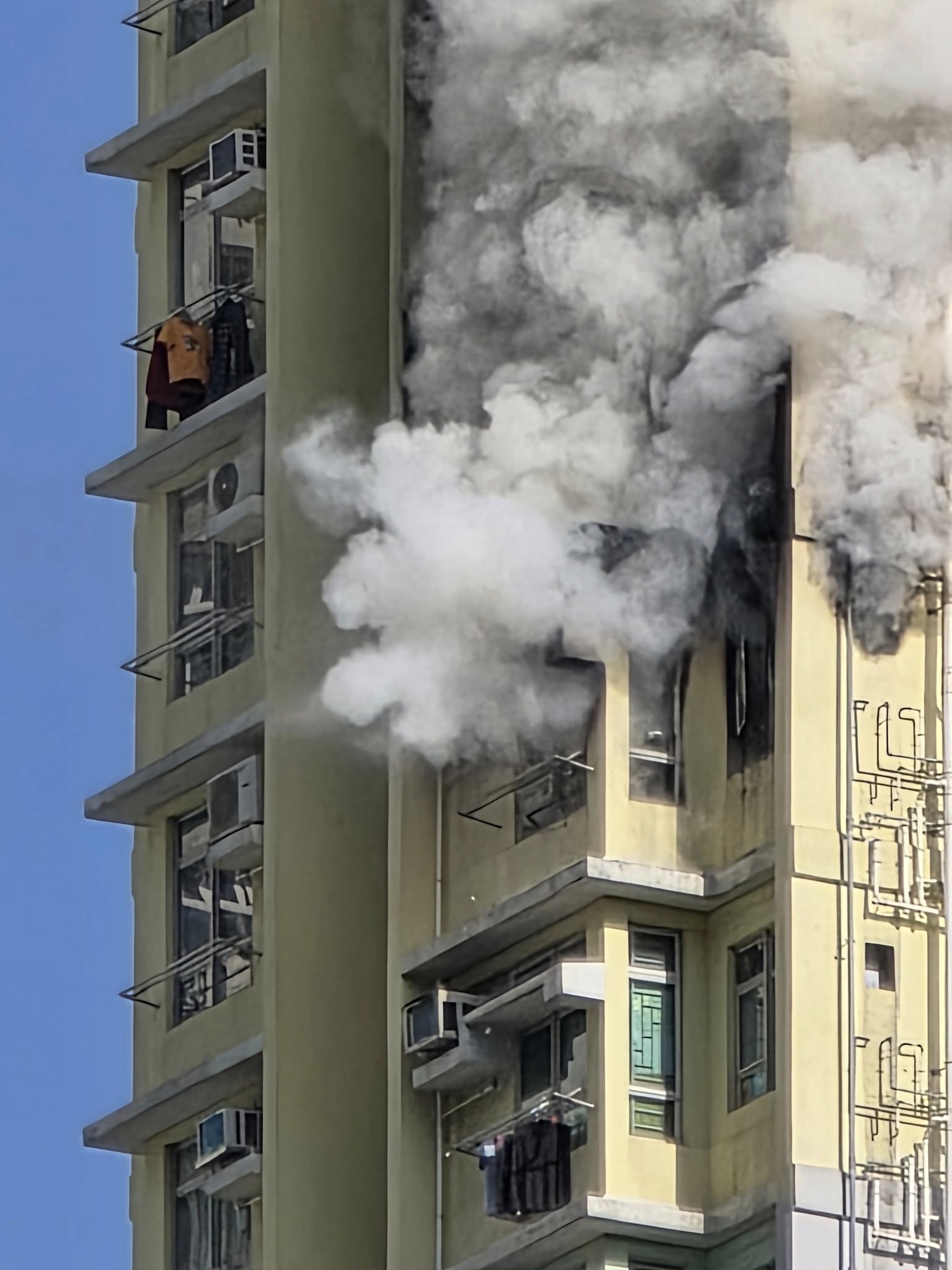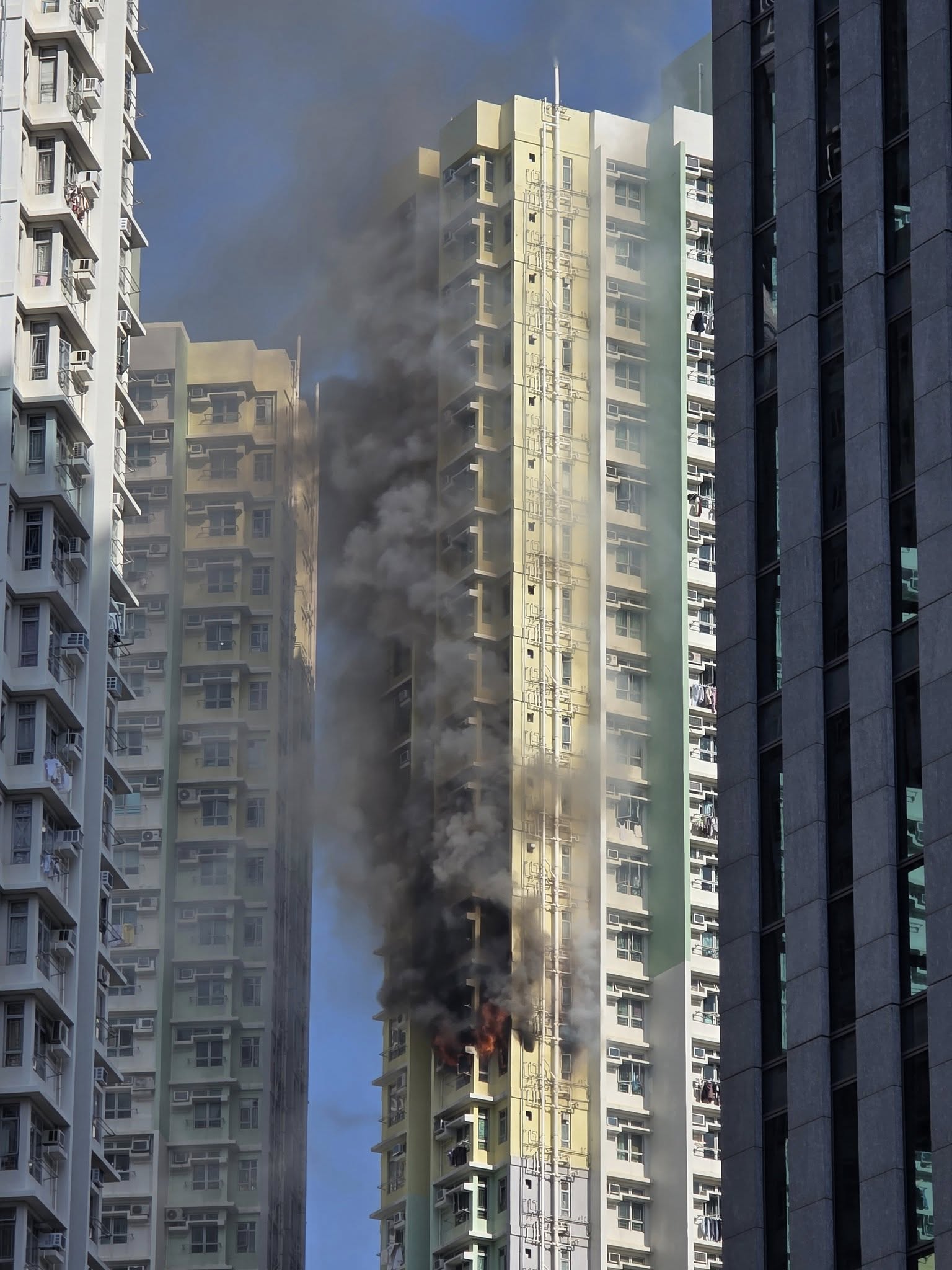 消防接獲多個火警報告,後派員到場救火,近百居民自行疏散到地下安全位置,暫時未有傷亡報告。