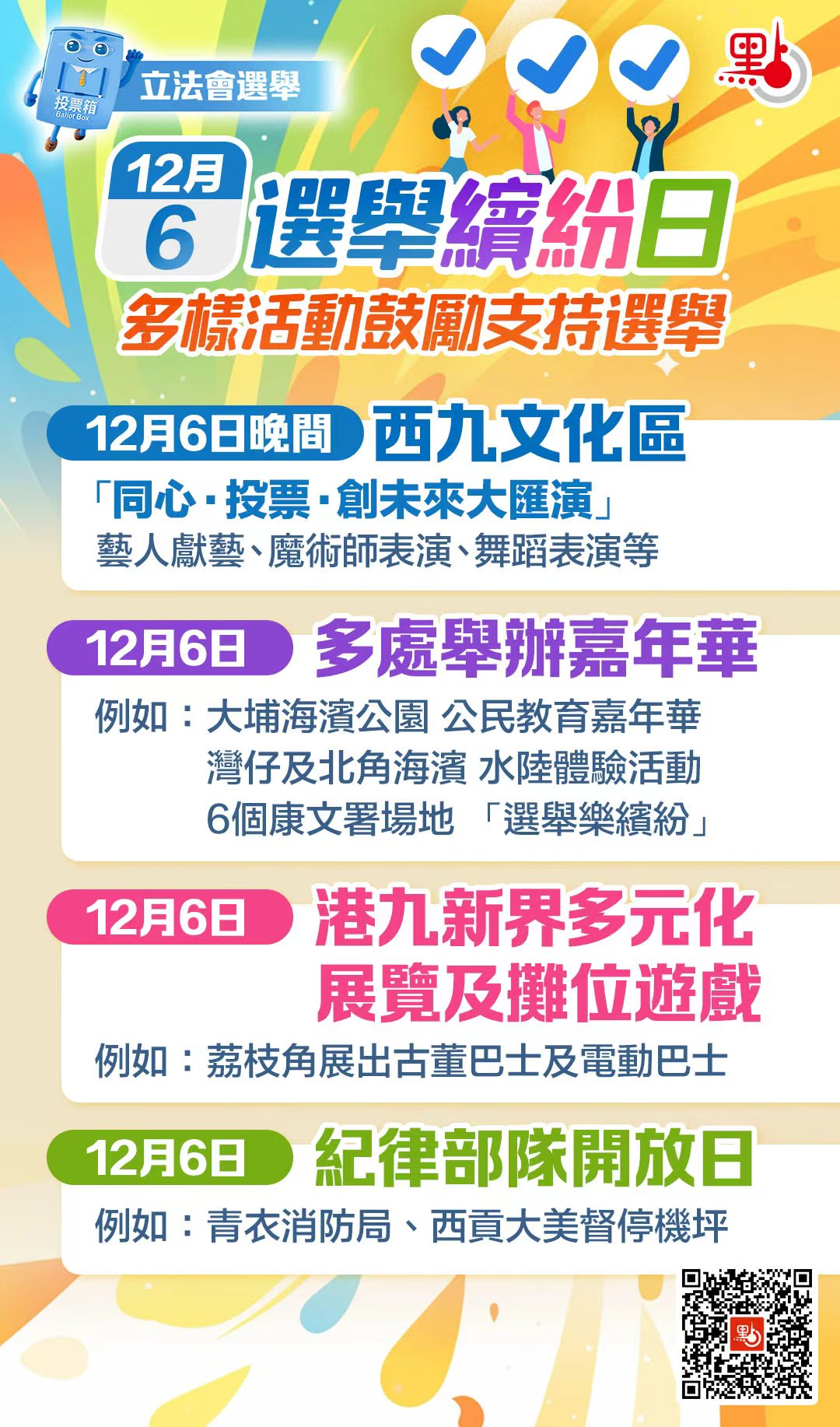 二、於12月6日多處舉辦嘉年華,例如在大埔海濱公園舉行公民教育嘉年華,以及在灣仔及北角海濱提供水陸體驗活動等。康樂及文化事務署將於6個場地推出「選舉樂繽紛」活動,推出體育元素之互動體驗。