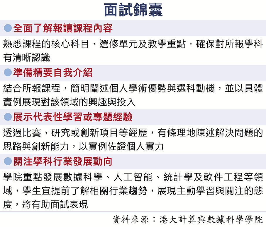 林德華建議,申請人面試前應全面了解課程的具體內容;準備簡短自我介紹,結合課程選擇與真實事例,突出學業優勢及選科動機;在面試中展示代表性的學習或專題經驗;並提前了解所報課程領域的行業發展,展現主動關注的態度。