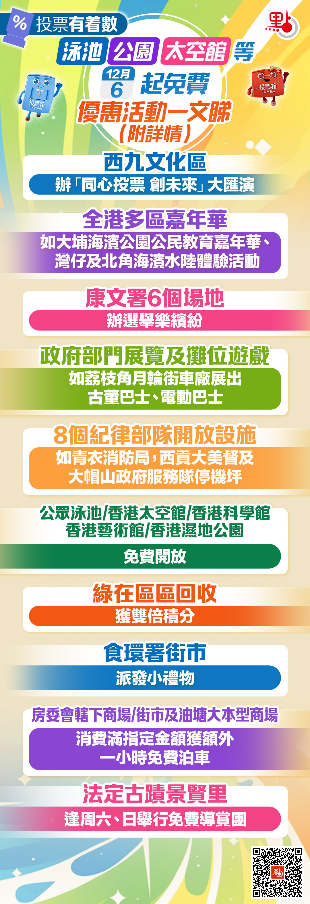 另外,市民在使用綠在區區進行回收時,會獲得雙倍積分;食環署會在12月6日及7日在街市進行選舉宣傳活動,向市民派發小禮物;房委會轄下商場、街市,及油塘「大本型」商場,消費滿指定金額,可獲額外一小時免費泊車;還有多項參觀歷史建築古蹟優惠,12月6日起,法定古蹟景賢里會逢周六、日舉行免費導賞團。