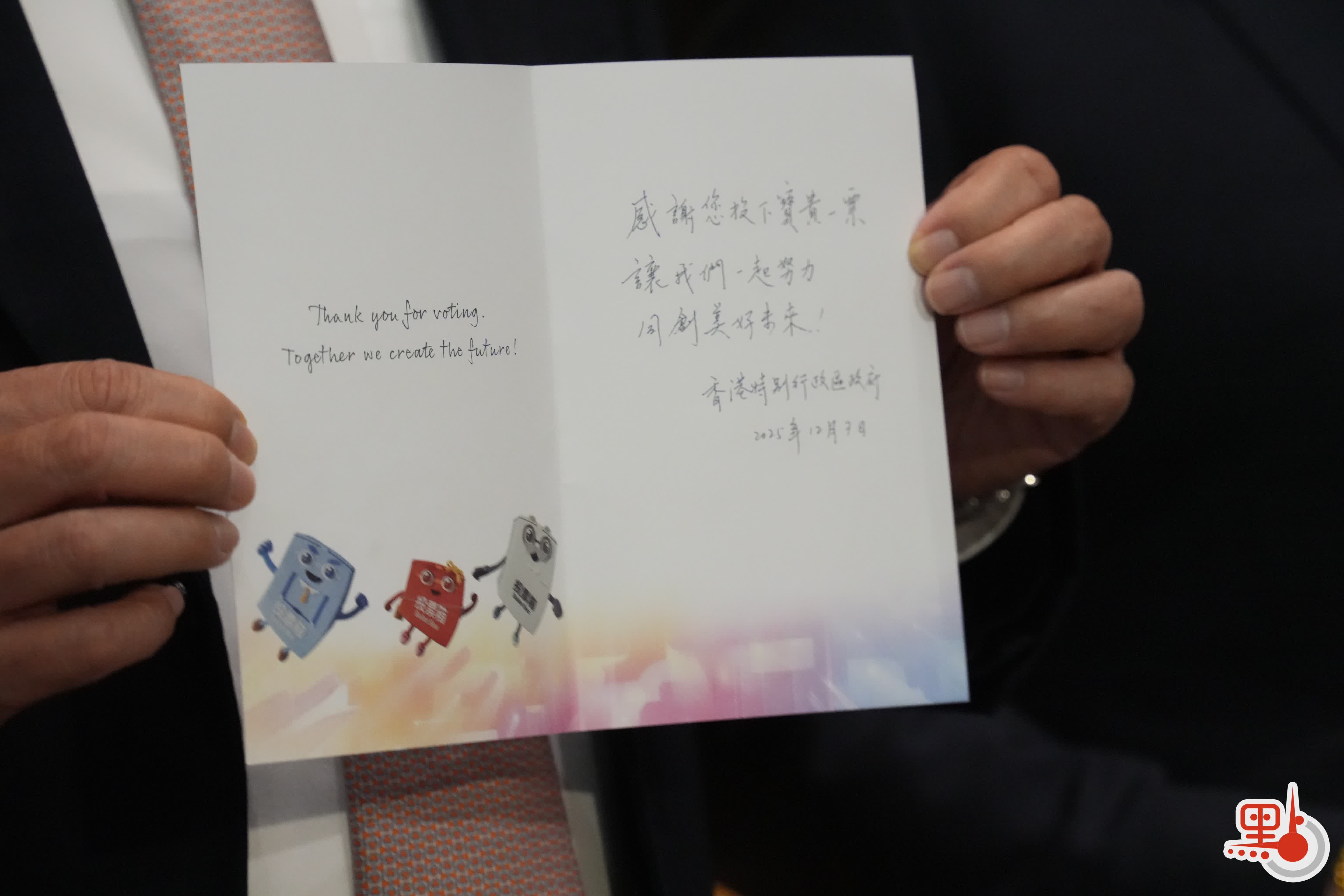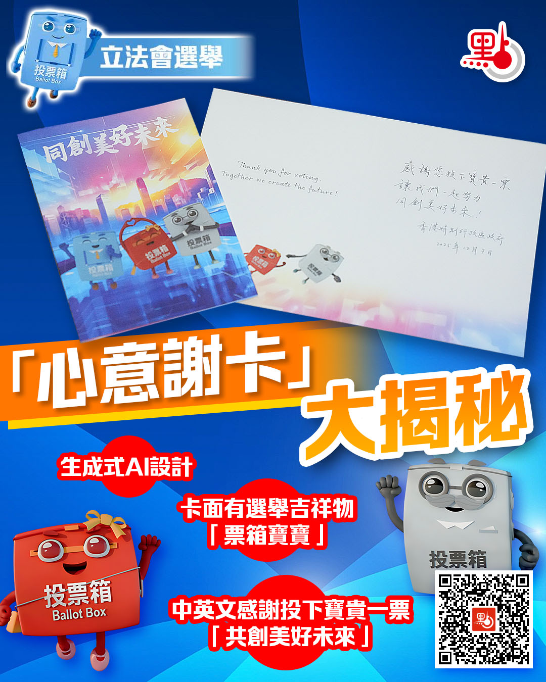 陳國基說,為感謝市民參與立法會選舉,選民於投票站完成投票後,將獲派一張心意謝卡。此謝卡由香港生成式人工智能研發中心團隊運用生成式AI技術設計,並由政府新聞處及政府物流服務署製作印刷。封面有選舉吉祥物「票箱寶寶」——藍小寶、紅小寶及白爺爺,寓意全社會攜手努力,共創香港美好未來。