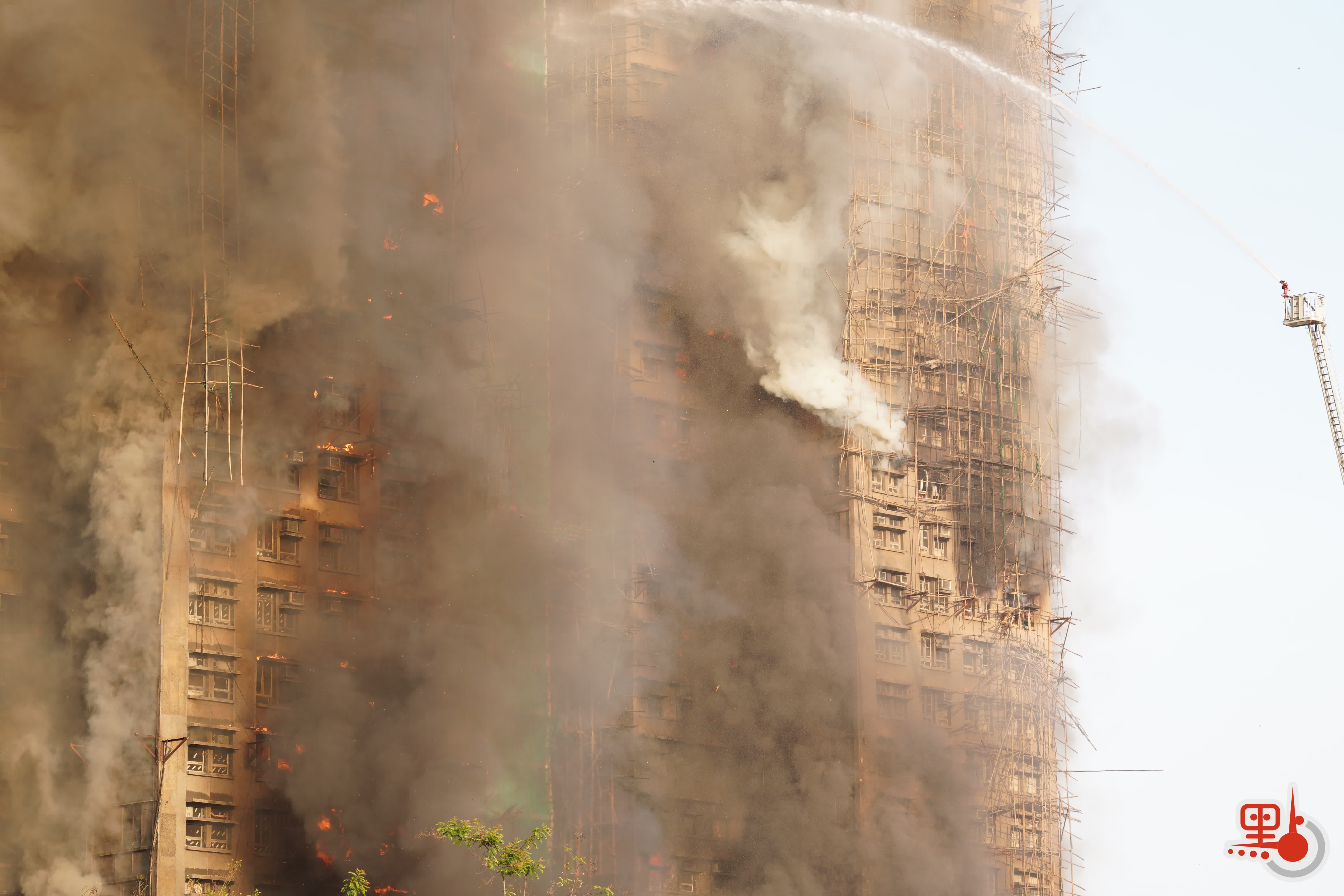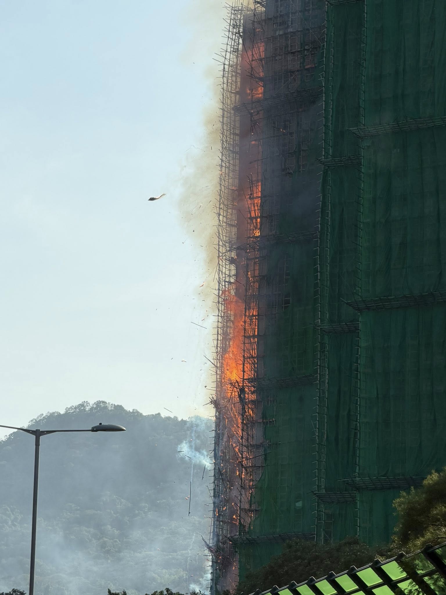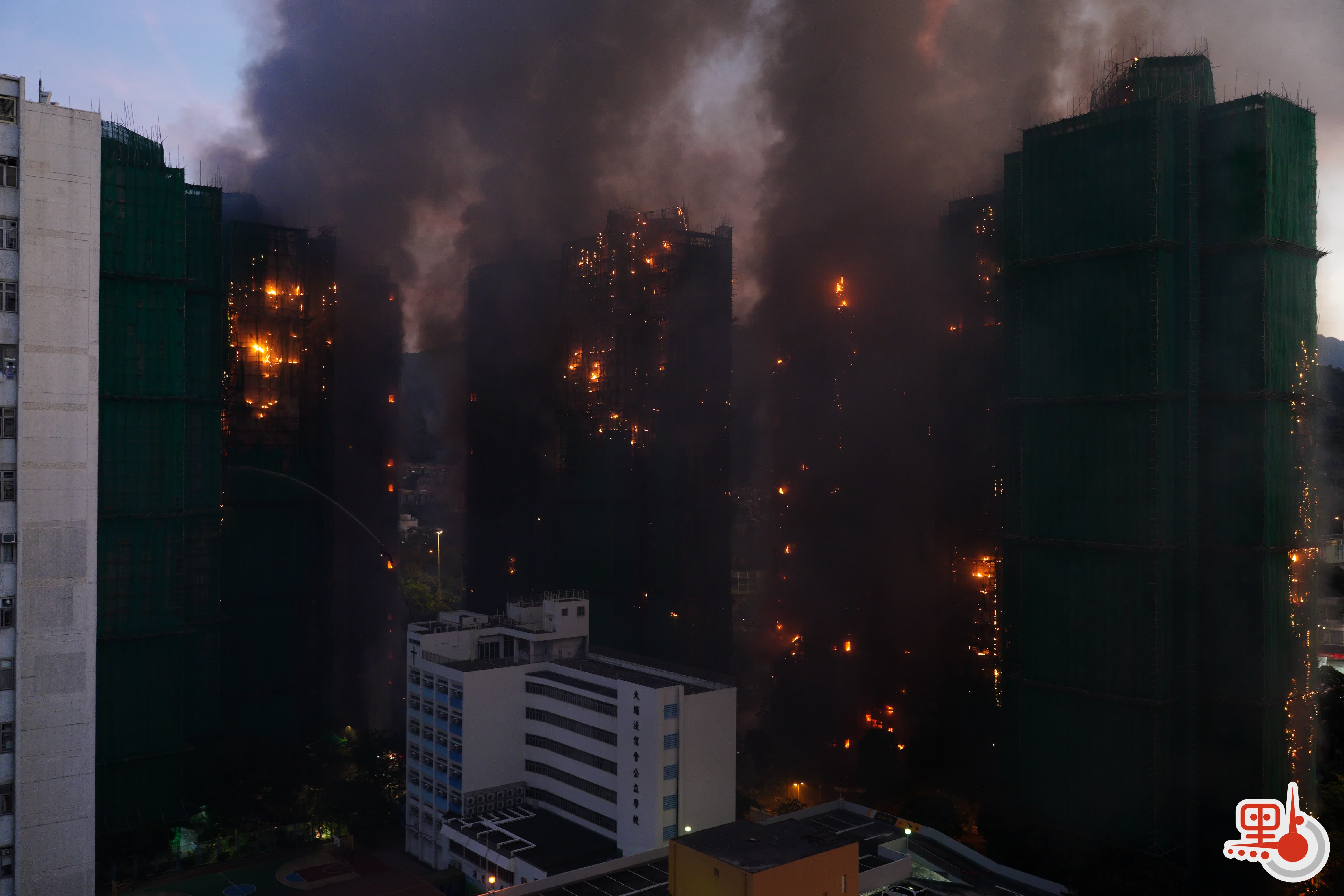 【18:30】入夜後火勢越來越大,有大廈火光沖至數十米高,周圍不斷有帶火星的燃燒灰燼掉落,不時還有爆破聲。