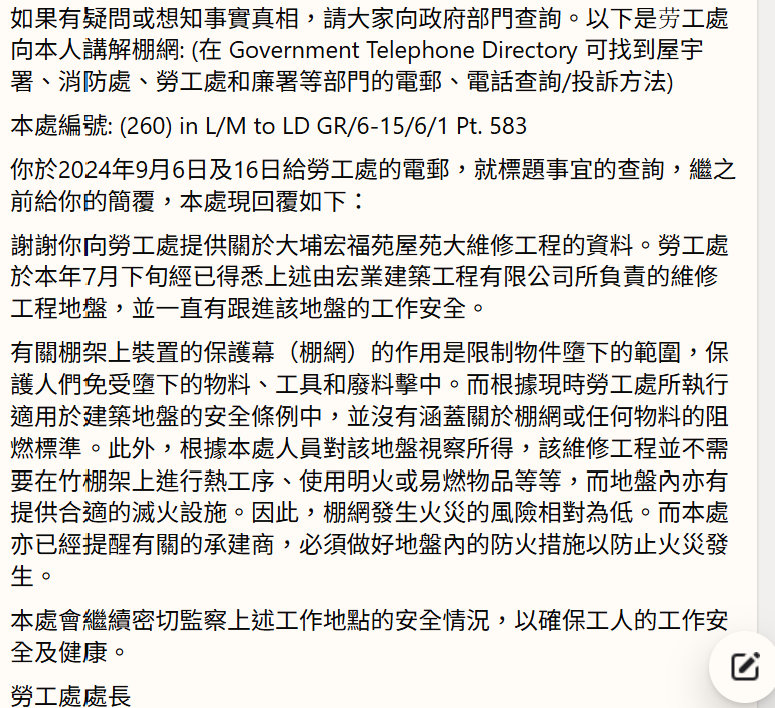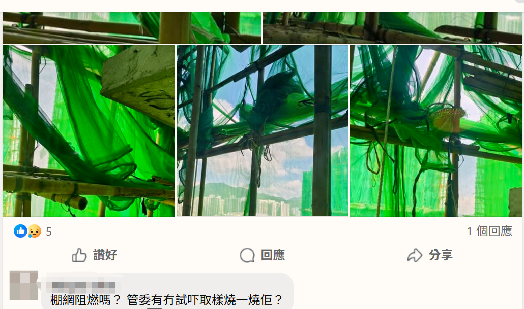 關於棚網相關問題,去年亦曾有居民向政府部門查詢,惟當時建築地盤的安全條例中,並沒有涵蓋關於棚網或任何物料的阻燃標準。