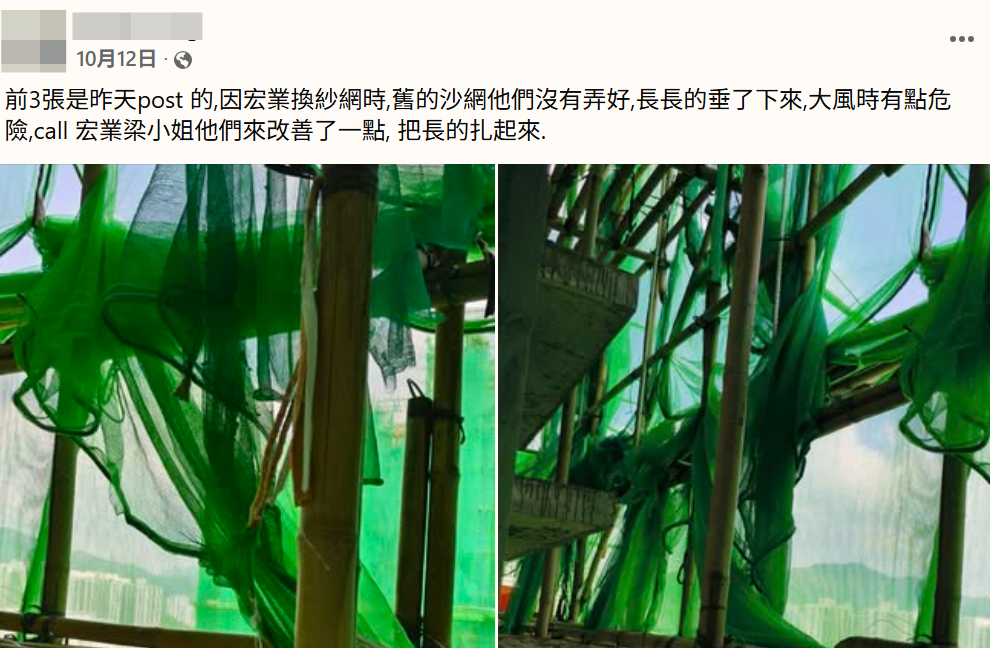 此外,大維修至今年,受超強颱風「樺加沙」影響,有關棚架結構出現損毀,在10月上旬需要進行加固修葺工作,當時有居民於社交平台群組發文,直指紗網垂下相當危險,更有人質問棚網是否阻燃。