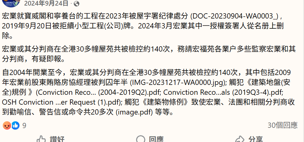 惟有關承建商曾多次出現違規事宜或被檢控,不少居民對此感到擔憂。有居民於討論群組直指:「『宏業』於2023年12月12日註冊續牌至今仍未獲屋宇署接受(沒有接受紀律處分的承建商在28天內便完成續牌),因為『宏業』曾/正接受紀律處分,所以『宏業』至今仍未註冊續牌成功,而『宏業』的牌照有效期是2024年3月8日,之後便有機會無效(而且是高風險),呢個情況必須避免選『宏業』,因為後果會直接損害所有持份者(即全部業主)利益。」