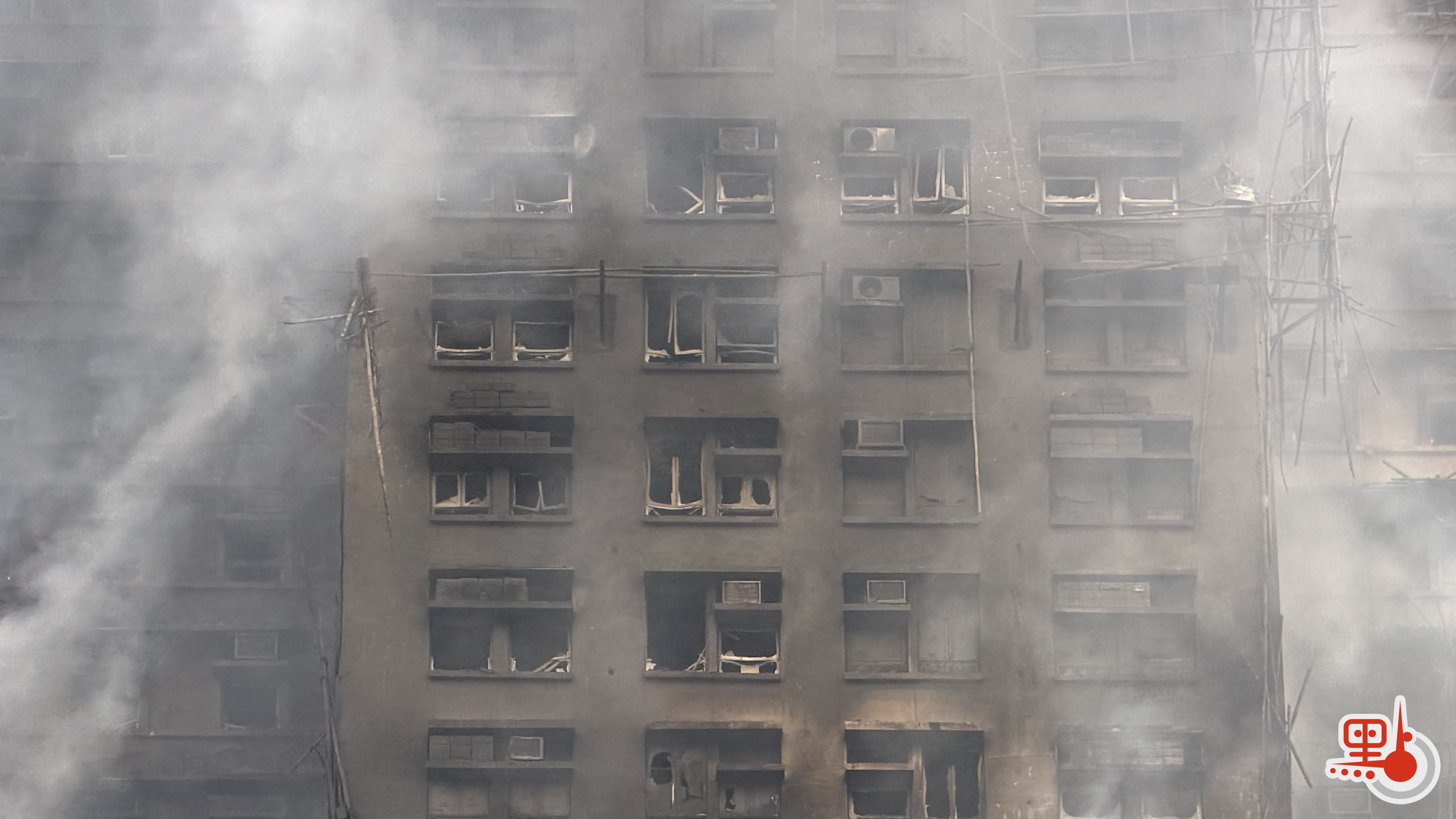 點新聞記者今早在現場觀察到,目前宏泰閣、宏道閣的高處樓層仍有明顯火星。宏仁閣左側棚架完整,牆體未有非常明顯的燒焦痕跡,但靠近中間部分,包括宏道閣全部、宏泰閣左側燒焦痕跡明顯,窗玻璃都炸了,窗口冷氣只剩骨架。
