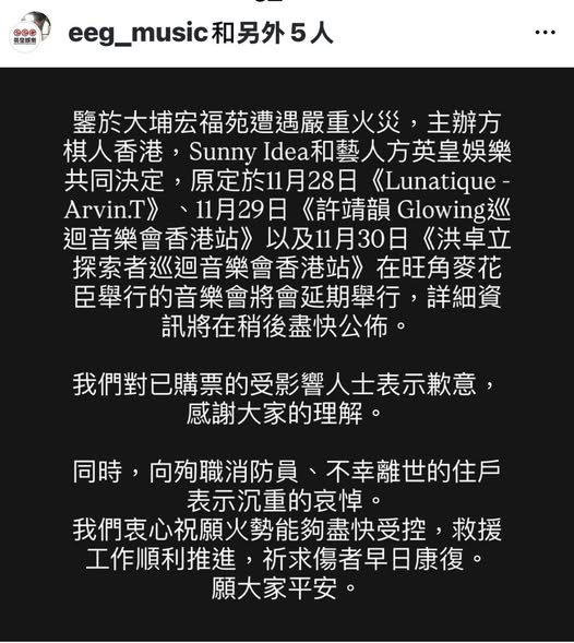 英皇娛樂宣布,旗下歌手曾傲棐、許靖韻及洪卓立的演唱會將延期。英皇娛樂發文指,鑒於大埔宏福苑遭遇嚴重火災,原定於11月28日的曾傲棐《Lunatique-Arvin.T》演唱會、11月29日《許靖韻Glowing巡迴音樂會香港站》以及11月30日《洪卓立探索者巡迴音樂會香港站》將會延期舉行,對已購票的受影響人士表示歉意,感謝大家的理解。同時,向殉職消防員、不幸離世的住戶表示沉重的哀悼。衷心祝願火勢能夠盡快受控,救援工作順利推進,祈求傷者早日康復。