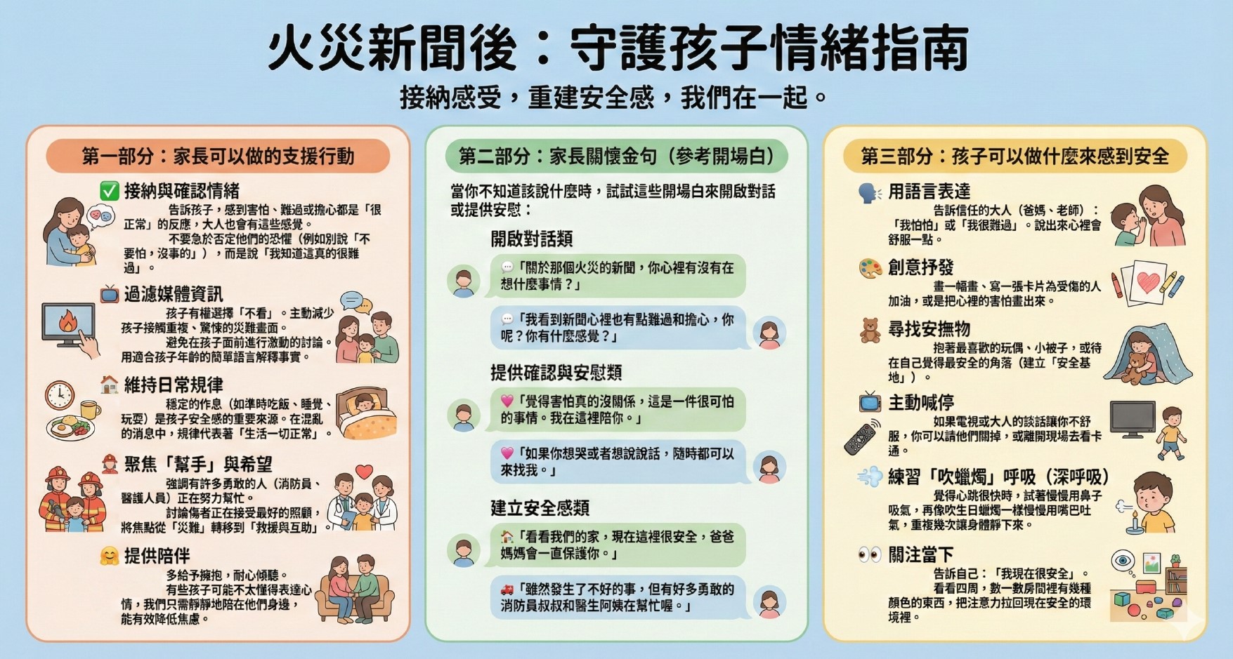 指南另提供「關懷金句」供家長作參考,如「關於那個火災的新聞,你心裏有沒有在想什麼事情?」、「覺得害怕真的沒關係,這是一件很可怕的事情,我在這裏陪你」等話語,為孩子提供安慰。