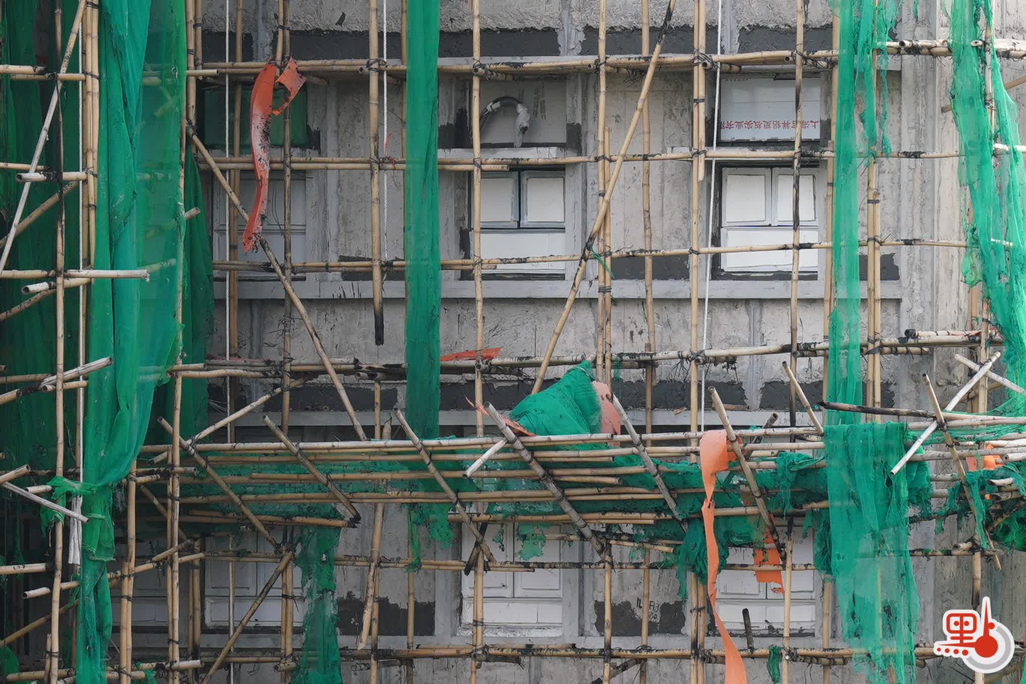 此外,記者亦觀察到,在宏仁閣火勢相對較輕的樓層,棚網被被燒後,露出了棚架內的情景。窗戶上白色的發泡膠清晰可見,家家戶戶的窗戶都被發泡膠封死。