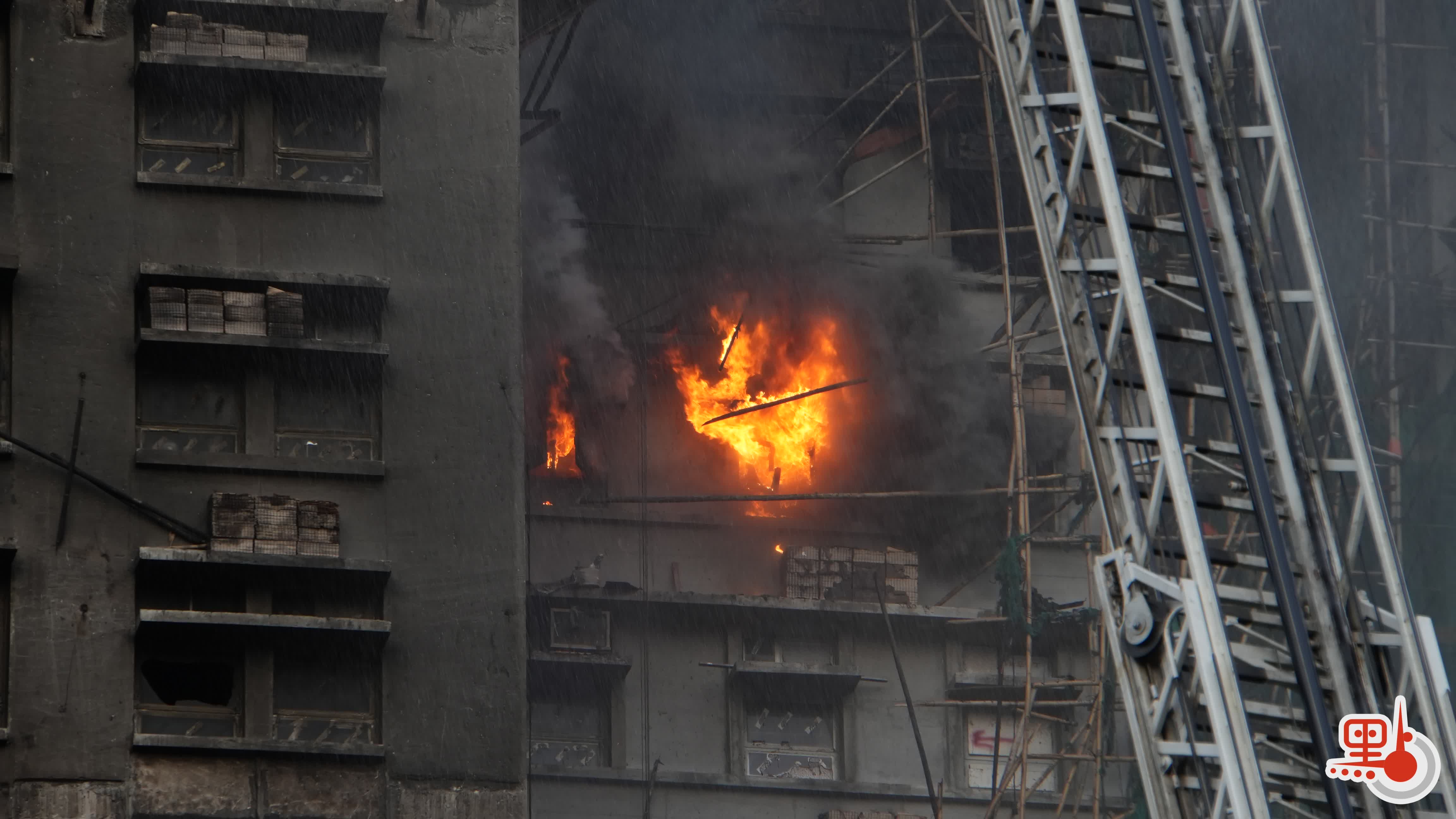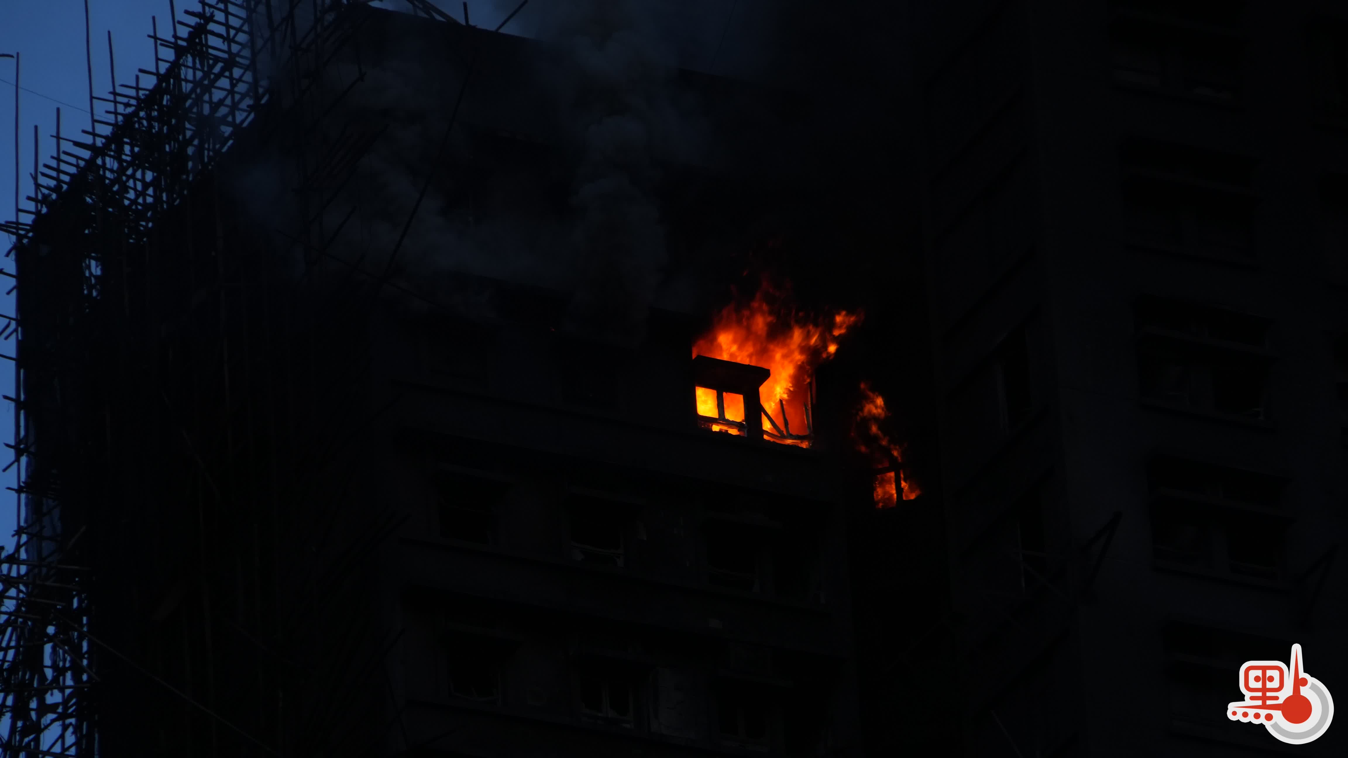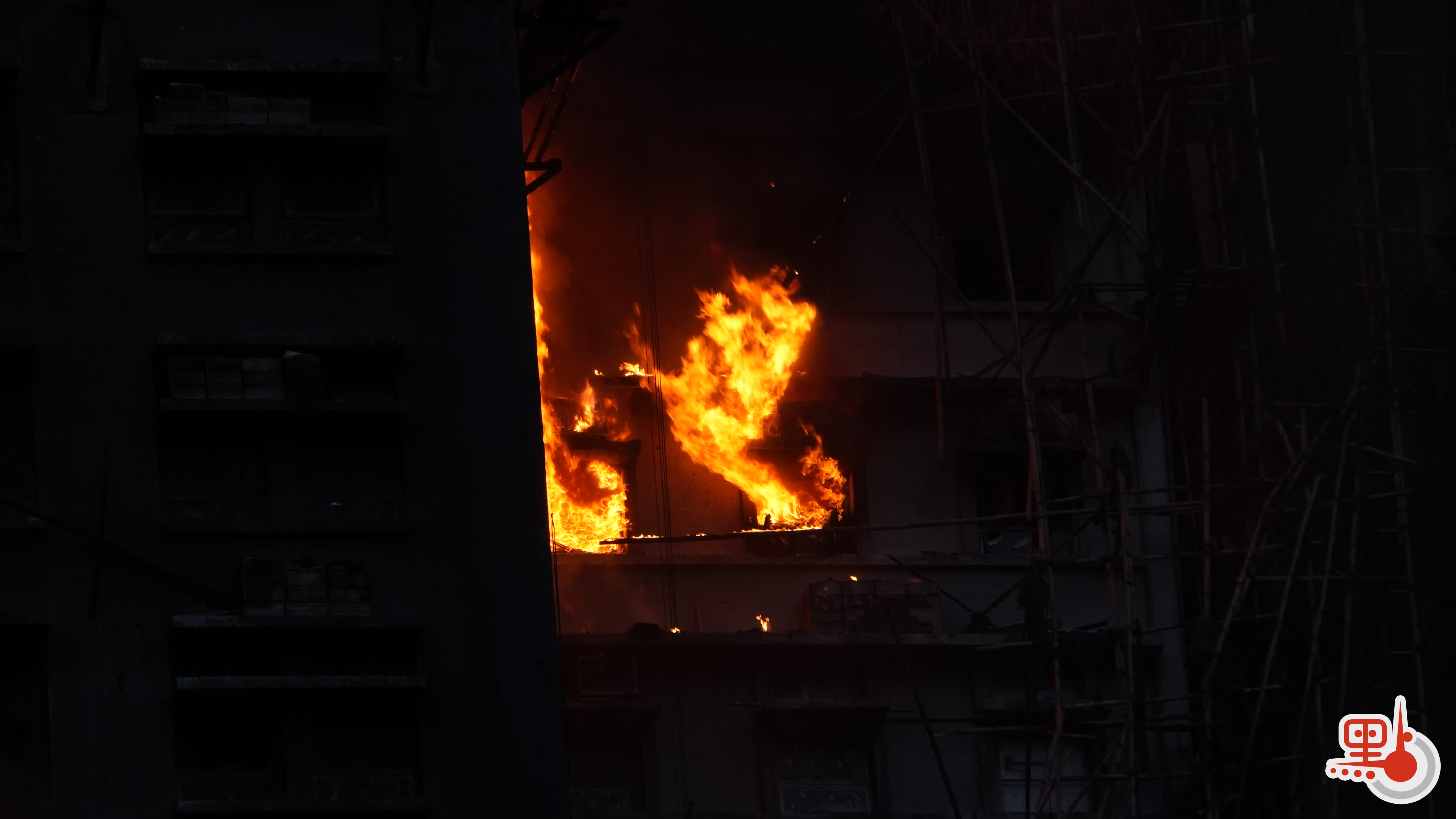 點新聞記者在現場看到,大約在下午5時15分,宏新閣中層單位突然有碩大火舌噴出,愈燃愈烈,水槍已進行集中救噴射;約5時20分,原本一直在冒煙的宏泰閣高層,突然有火舌噴出;約5時24分,宏泰閣再出現一處明顯有火舌噴出的位置,此方位早前有黑色濃煙不斷向外飄出;隨後,宏建閣亦再出現火舌。有消防員在現場搜救。