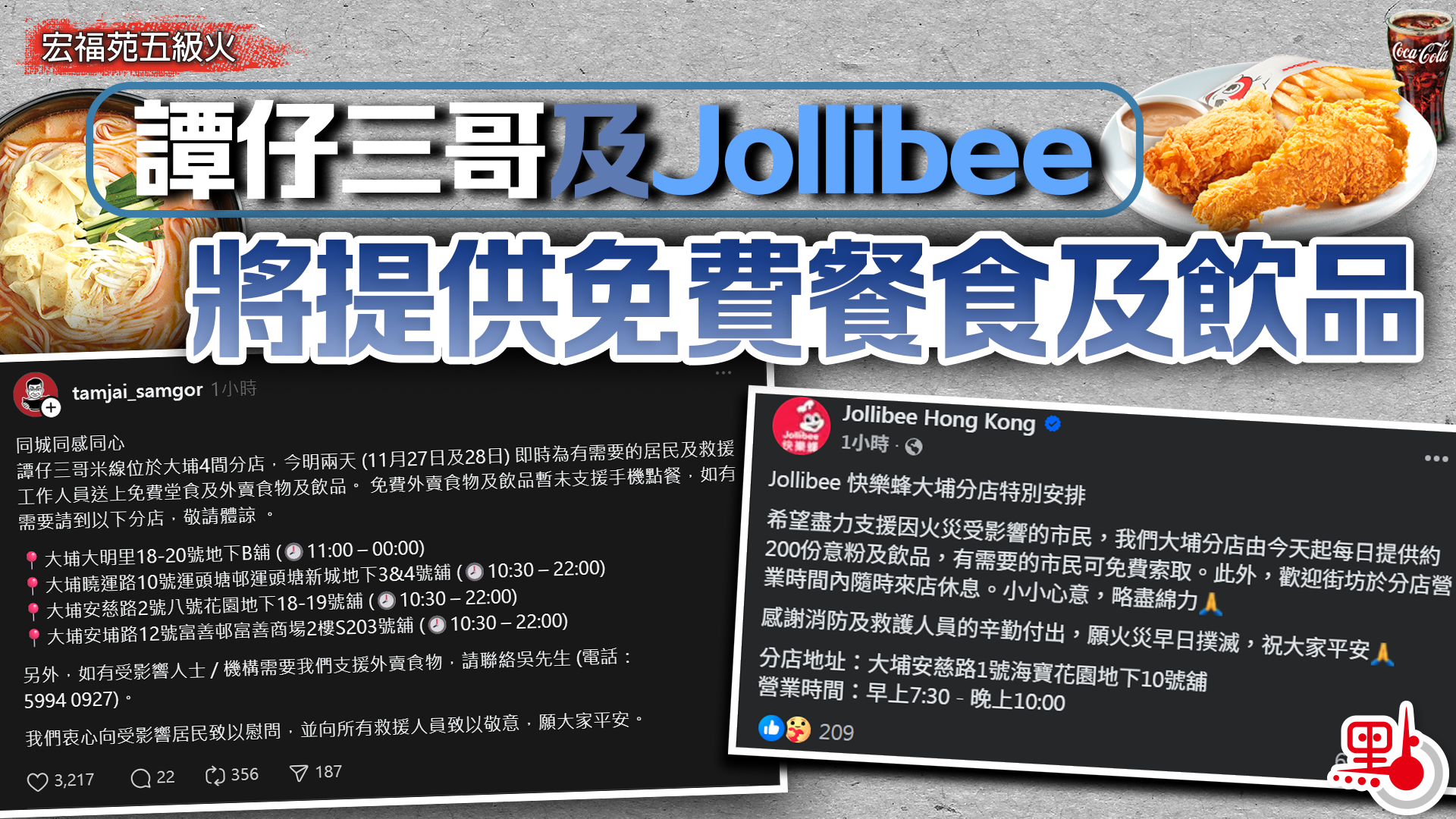 宏福苑五級火|譚仔三哥及Jollibee 將提供免費餐食及飲品