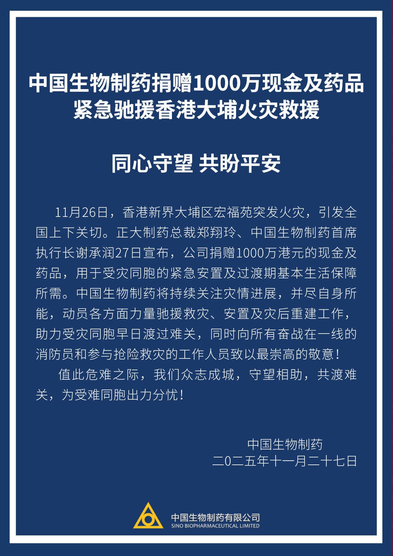 宏福苑五級火|中國生物製藥捐1000萬現金及藥品 馳援大埔火災救援