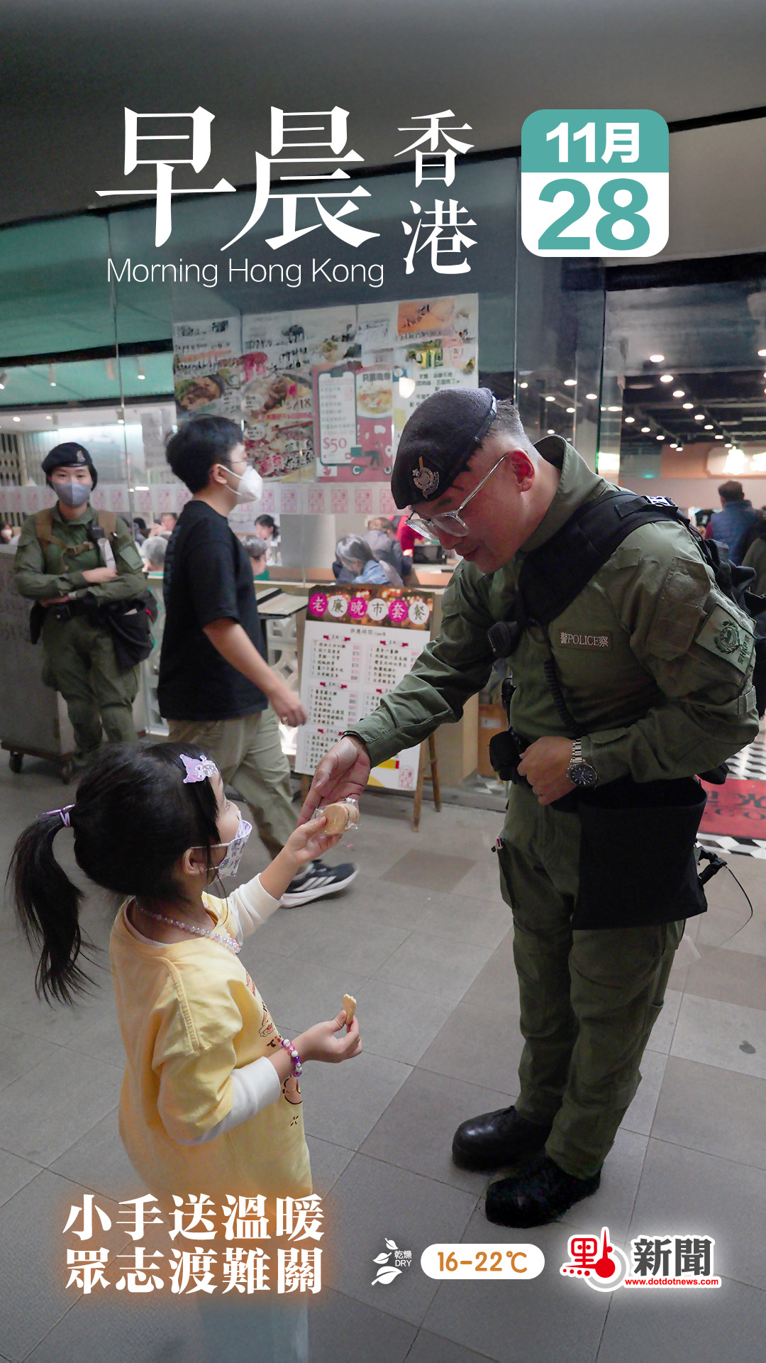【點新聞報道】大埔宏福苑於11月26日發生五級火警,造成多人傷亡。截至昨日下午,該火警已導致最少55人身亡,超過60人受傷。點新聞記者昨晚在火災現場周邊看到一幕溫暖畫面:一名五六歲的小女孩,將手中的餅乾送給正在執勤的警察,以她純真的方式表達對前線人員的感謝。