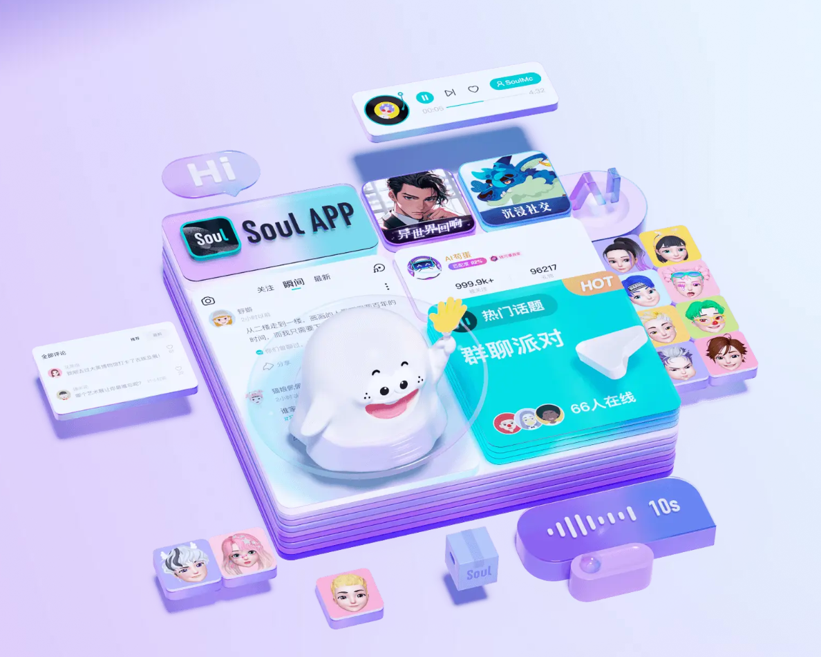 根據上市申請文件,Soul日均活躍用戶(DAU)中逾78.7%為Z世代。弗若斯特沙利文報告顯示,Soul是國內首個所有用戶均以虛擬身份(avatars)進行互動的AI+沉浸式社交網絡平台。平台基於用戶興趣圖譜,依託以自研的原生情緒價值第一大模型Soul X為代表的AI技術,為用戶提供沉浸式互動及情緒價值體驗。