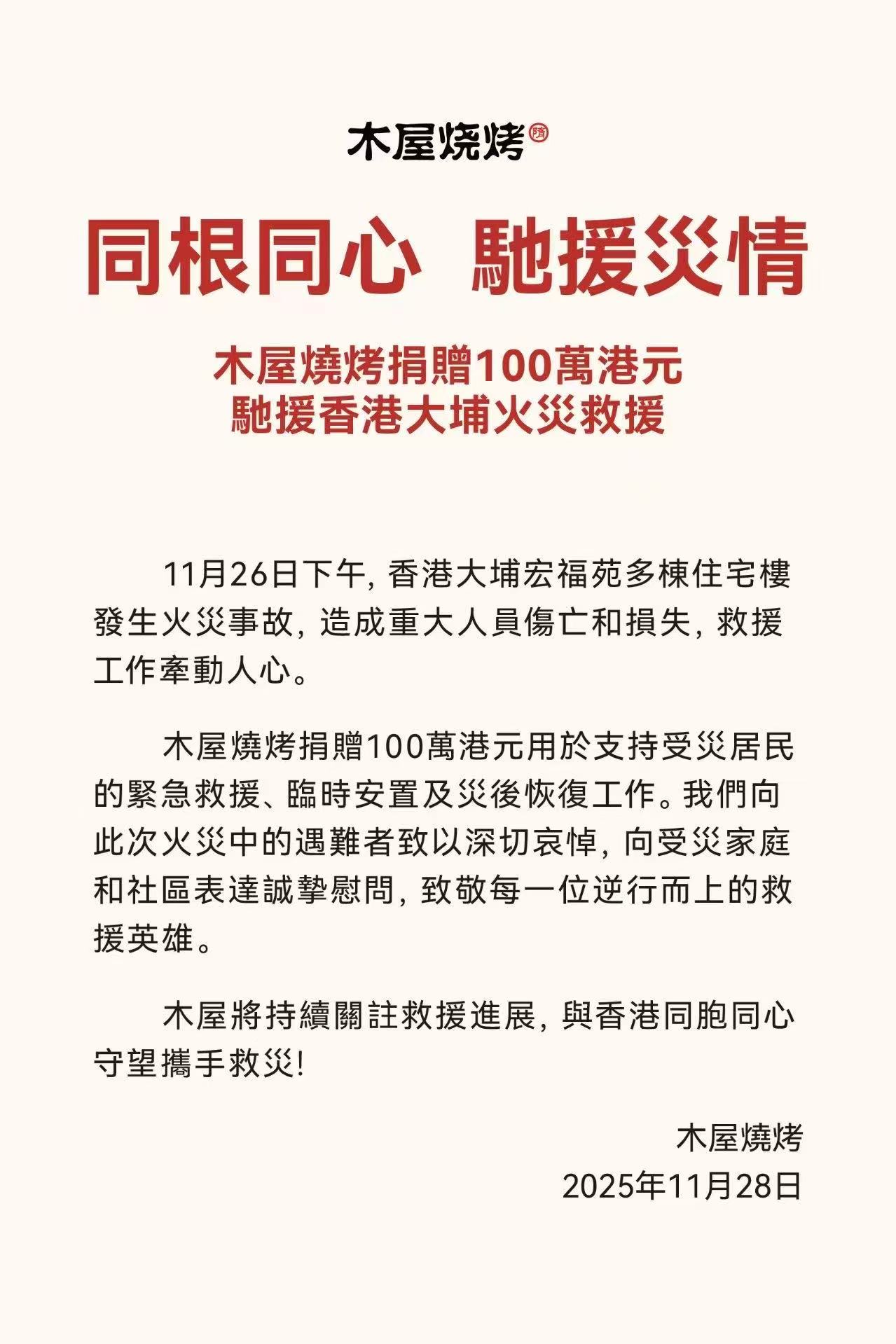 木屋燒烤捐赠100萬港元用於支持受災居民的緊急救援、臨時安置及災後恢復工作。木屋燒烤向此次火災中的遇難者致以深切哀悼,向受災家庭和社區表達誠挚慰問,致敬每一位逆行而上的救援英雄。
