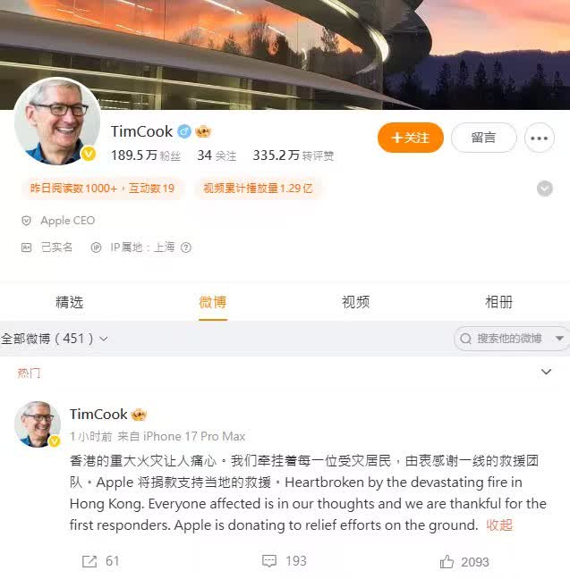庫克發帖文表示:「香港的重大火災讓人痛心。我們牽掛着每一位受災居民,由衷感謝一線的救援團隊。Apple將捐款支持當地的救援。Heartbroken by the devastating fire in Hong Kong. Everyone affected is in our thoughts and we are thankful for the first responders. Apple is donating to relief efforts on the ground.」