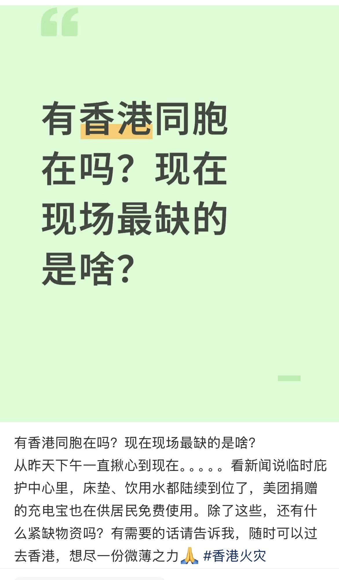 【點新聞報道】「尋找給香港捐款的官方渠道,很想為他們做點什麼」「我想為香港捐款,可以怎麼做?」「有香港同胞嗎?你們現在最缺什麼?」香港大埔宏福苑發生五級大火的消息,連日來持續牽動着內地民眾的心,各類飽含牽掛的聲援帖文,在內地社交網絡上不斷湧現。災情發生後,內地網友的愛心迅速凝聚,大家紛紛主動探尋捐贈渠道,用實際行動支援香港。