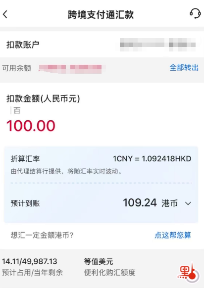 (如果首次使用,需填寫匯款人地址。)選取交易賬戶,輸入扣款金額,可選取到賬幣種。