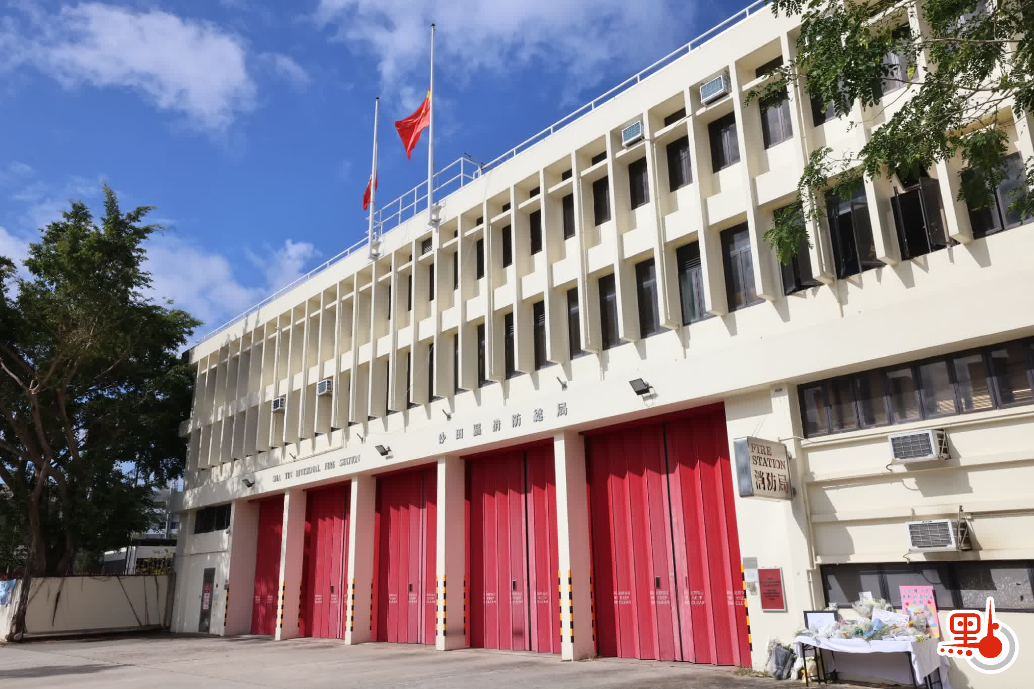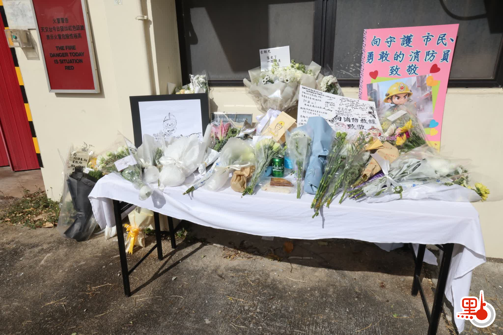 【點新聞報道】大埔宏福苑11月26日下午發生五級大火,造成多人死傷,一名名為何偉豪的消防員英勇殉職。今日(29日)早上8時,何偉豪生前駐守的沙田消防局下半旗誌哀及舉行默哀儀式。消防局外設有鋪上白布的桌子讓市民擺放鮮花及心意卡悼念,目前已擺滿鮮花、心意卡及祭品,有市民只能將鮮花置放地上,有心意卡寫着「願一路好走,辛苦你了」、「向守護市民、勇敢的消防員致敬」字句。