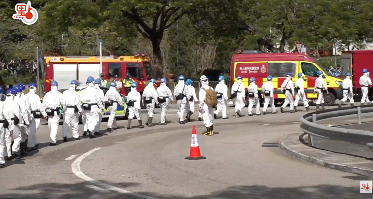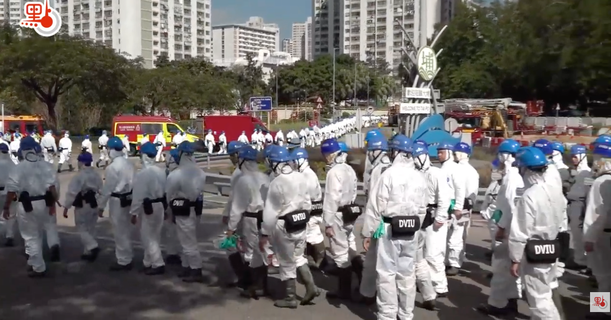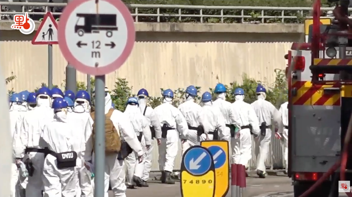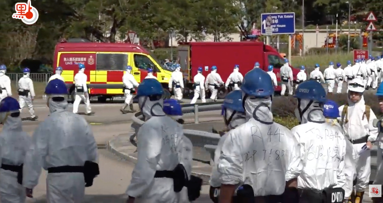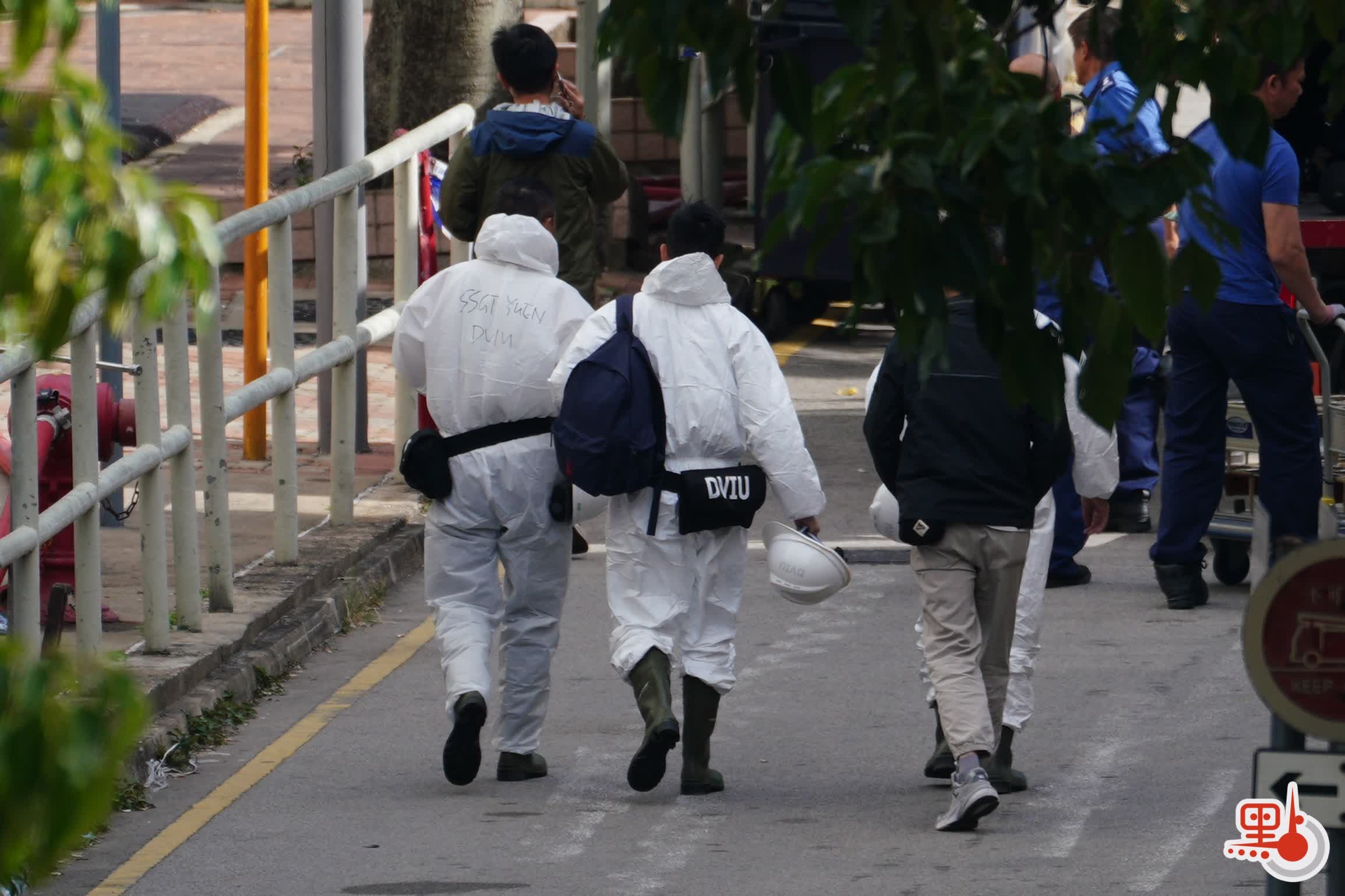穿着白色保護衣、戴藍色頭盔的災難遇害者辨認組(DVIU),今早9時許已經陸續集合在宏福苑附近的球場,至上午11時20分,共600名DVIU人員進入大廈。其間部份人曾用發泡膠箱盛載物品,也曾拿走一塊長方形的板,疑是火警中的證物。