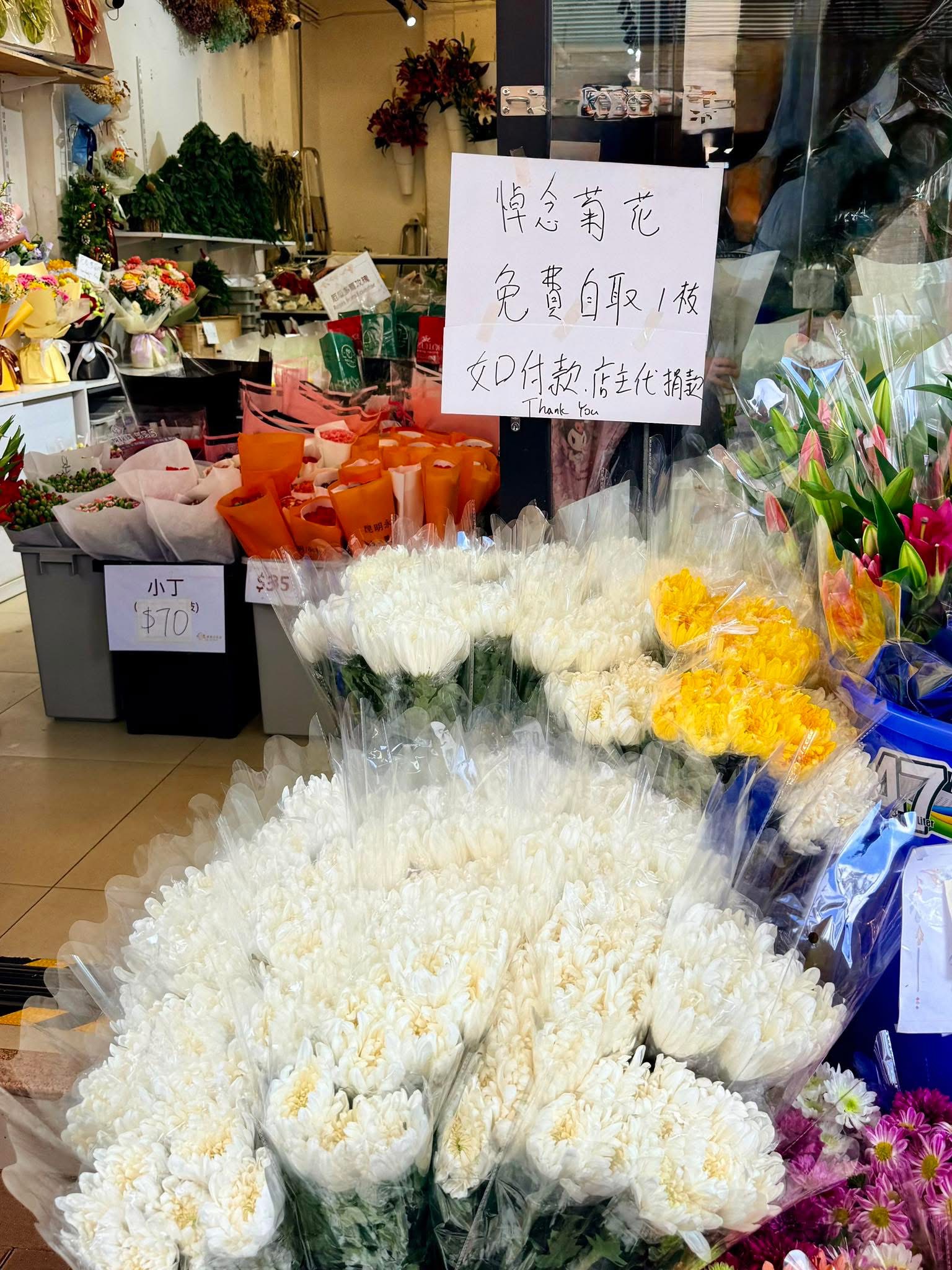 另外,油尖旺區花墟道一花店老闆為市民提供免費自取的悼念菊花,更表示會將市民的付款代為捐贈。
