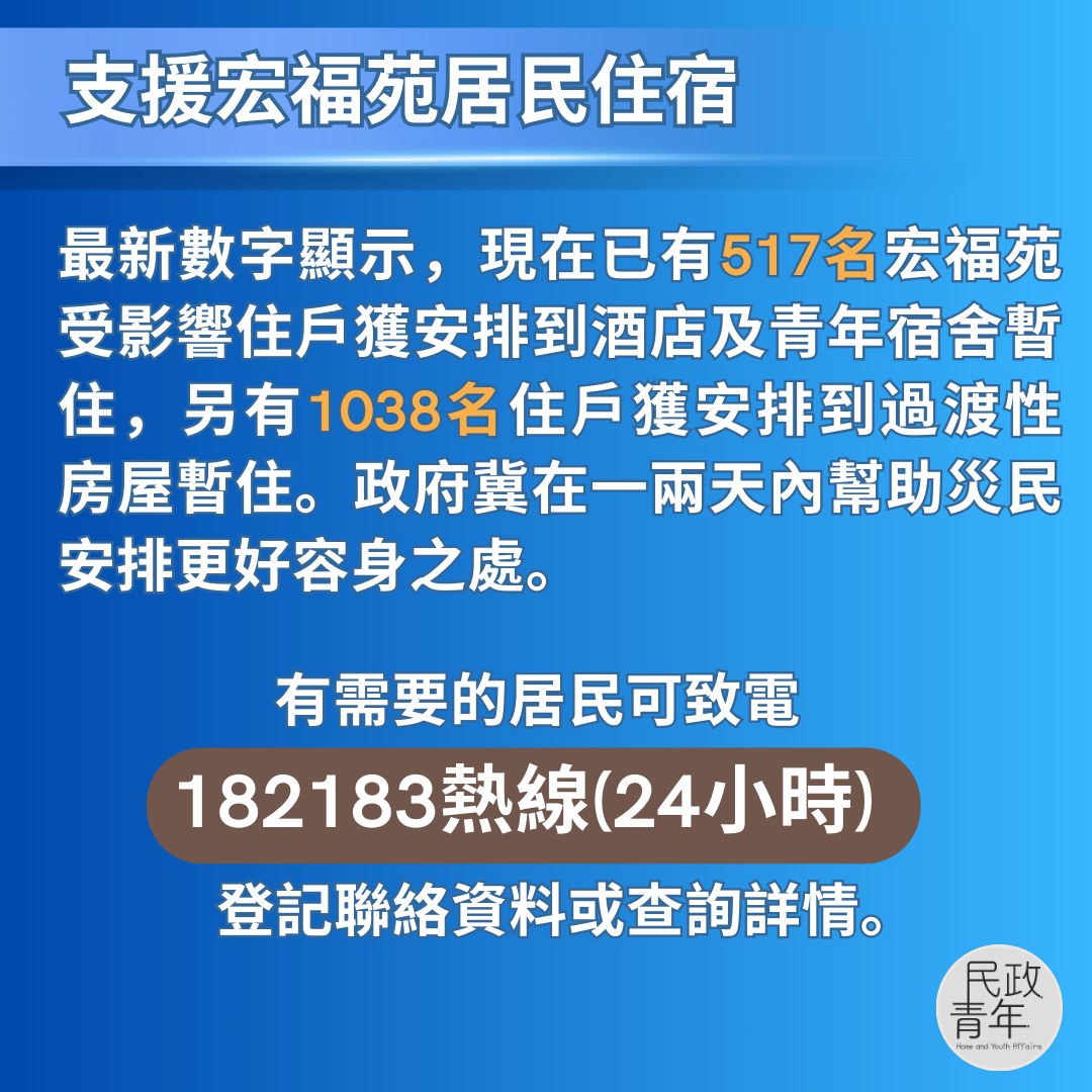 當局指出,現在的首要任務是把受影響的居民安置在較佳的居住環境,最新數字顯示,現在已有517名宏福苑受影響住戶獲安排到酒店及青年宿舍暫住,另有1038名住戶獲安排到過渡性房屋暫住。