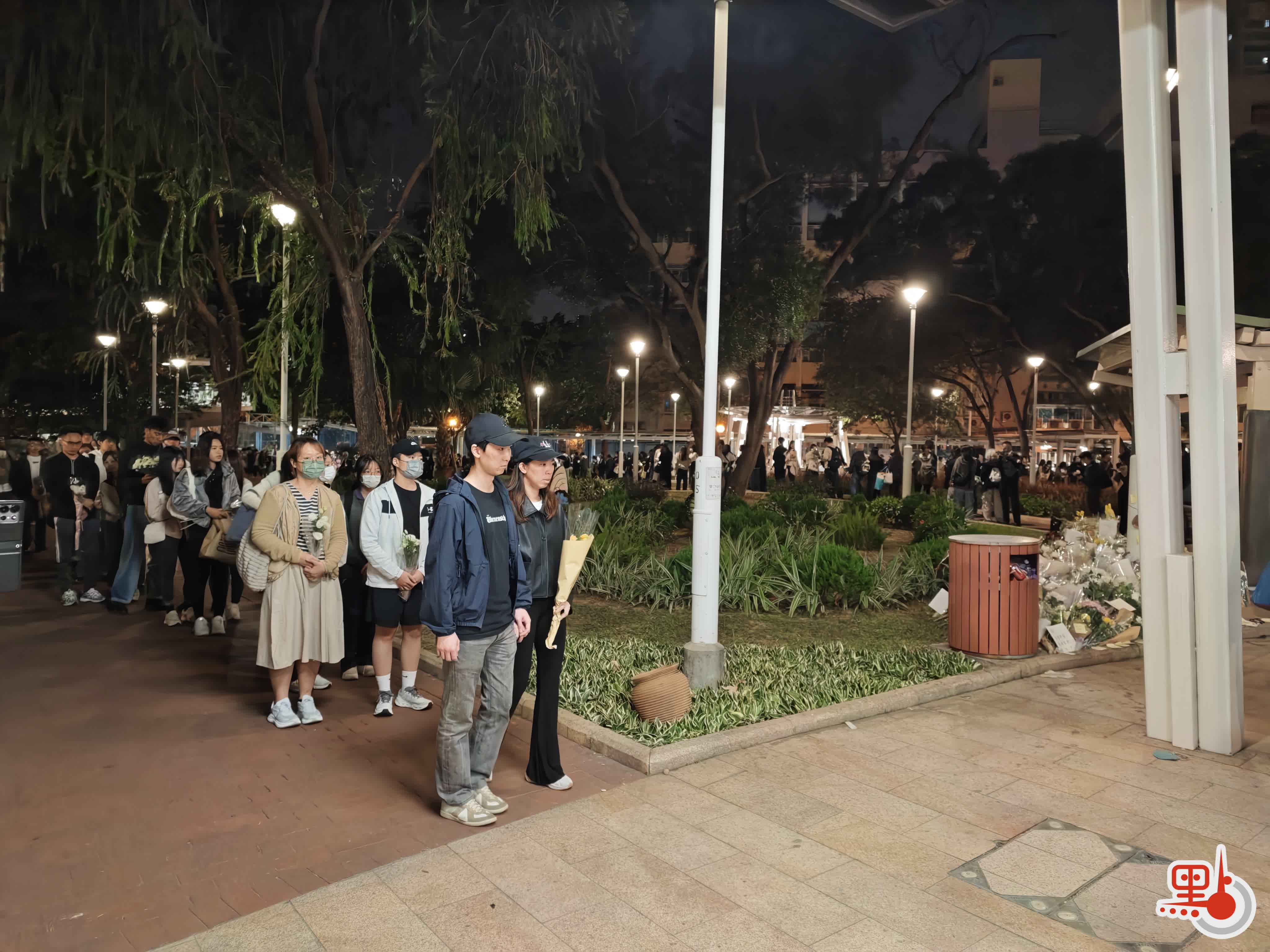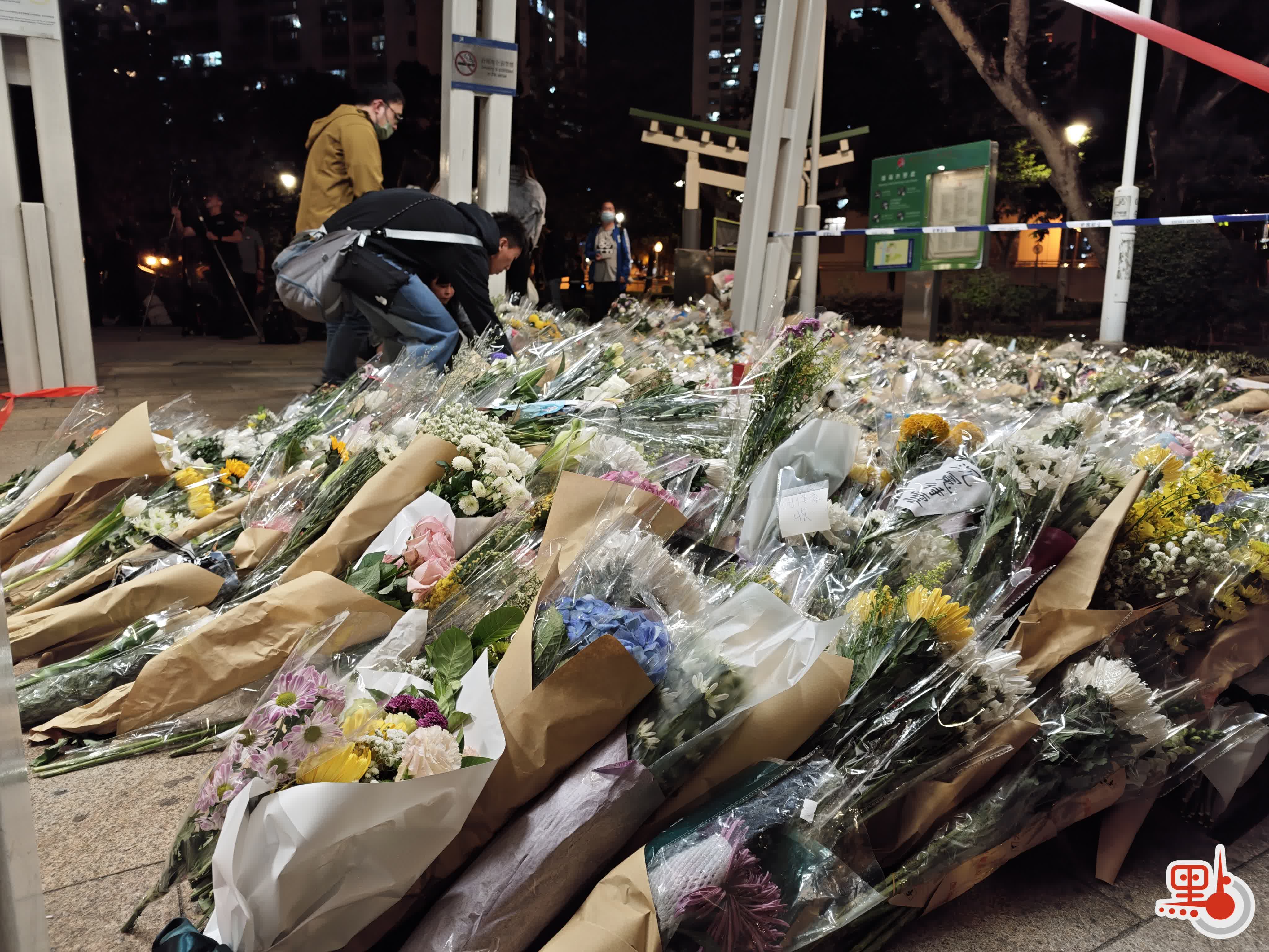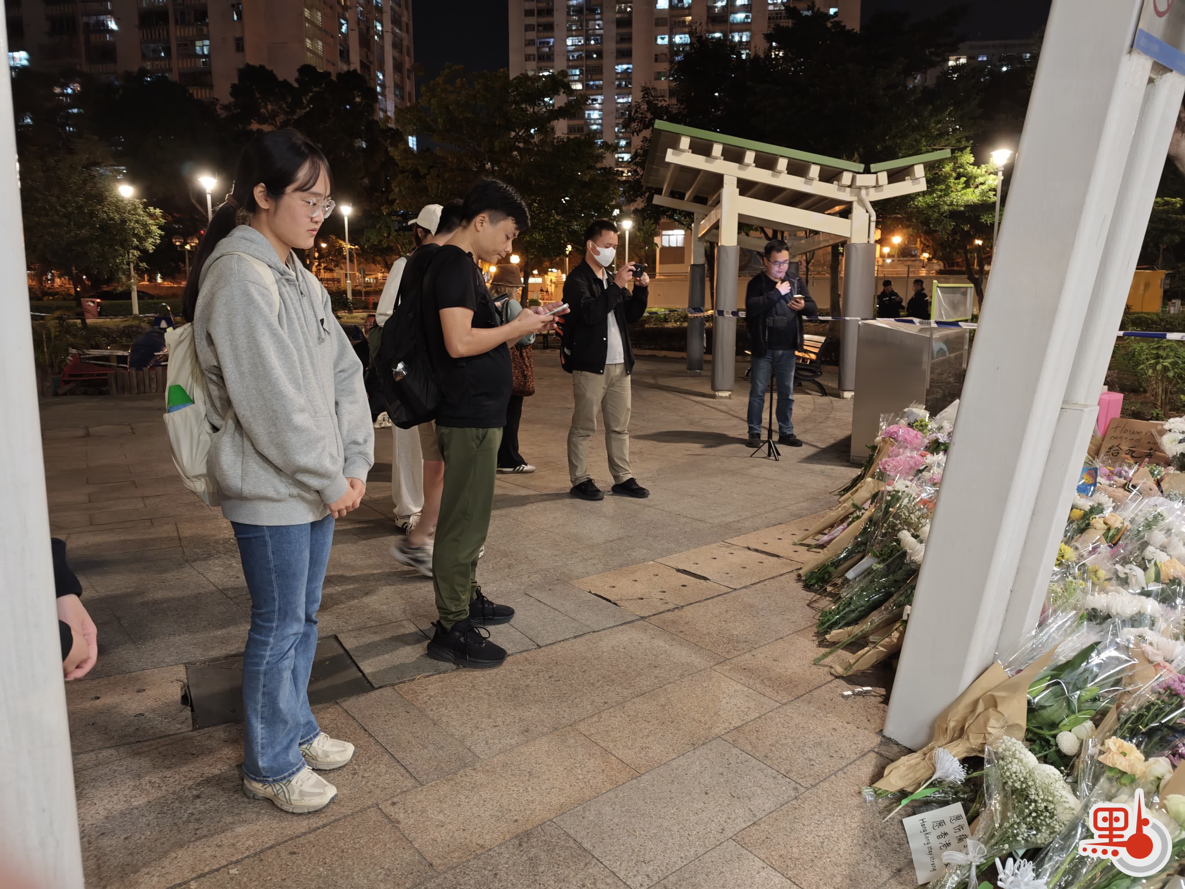 點新聞記者在現場目睹,下午5時許,廣場平台已出現獻花人龍,其後隊伍持續延長,直至晚上8時將整個廣場擠滿。市民有序排隊,輪流奉上花束,朵朵鮮花逐漸鋪陳於地面,匯聚成一片花海。獻花後的市民,駐足在宏福苑大樓前,久久不忍離開。